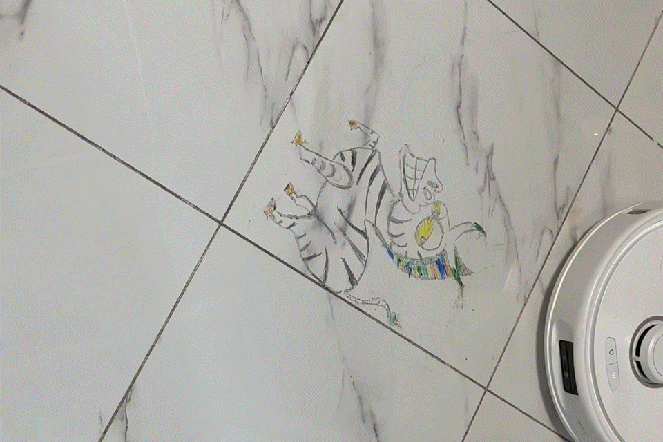 我闺女经常画在地上,以往,机器人清洁后我还需要用湿巾对蜡笔画进行再次清洁。但是现在,在使用时候PP进行清洁的过程中,当它检测到重污区域的时候,将会自动对该区域进行二次拖地,轻松的清洁掉地面上的蜡笔画,而且非常干净彻底。