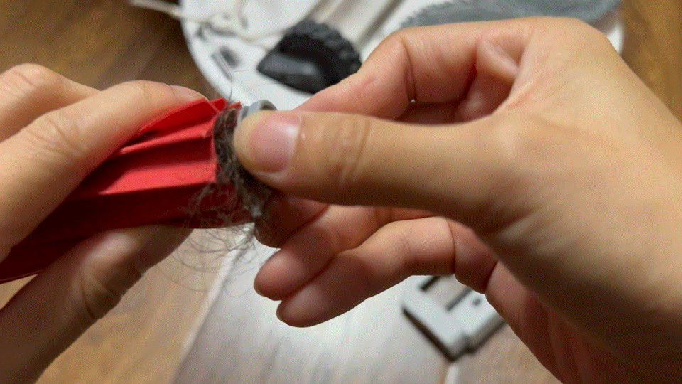 石头P10 Pro的防缠绕滚刷会将头发收集在滚刷两端,维护的时候只需要将顶端灰色圆钮旋转一下就可以了,随着圆钮被拿下的瞬间缠绕的头发也会随之掉落下来。不仅不会对滚刷进行缠绕,清洁起来也非常方便。