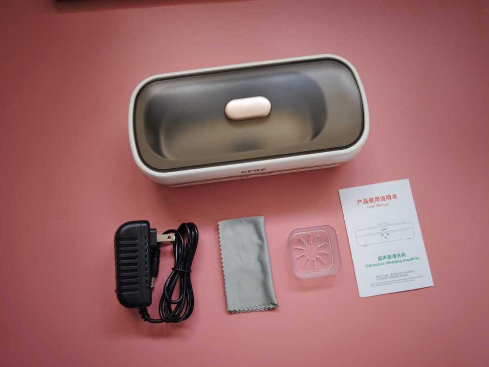 希亦CG超声波清洗机包括主机、电源适配器、垫高块、擦拭布、使用说明书。清洁机机身小巧,三围220*102*70mm,重量363.7g,造型给我的第一感觉有些像保温饭盒。整机乳白色,线条流畅,正面印有logo,下方是触摸开关和深度&快速指示灯。
