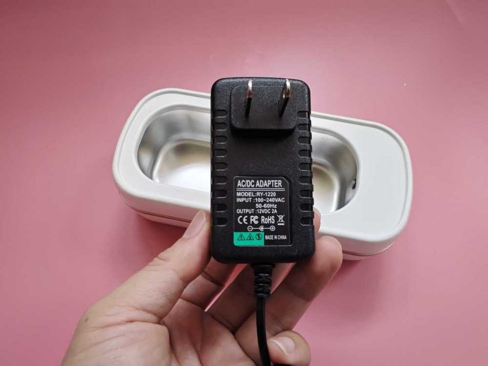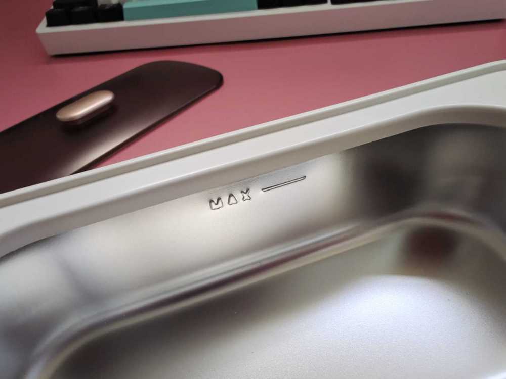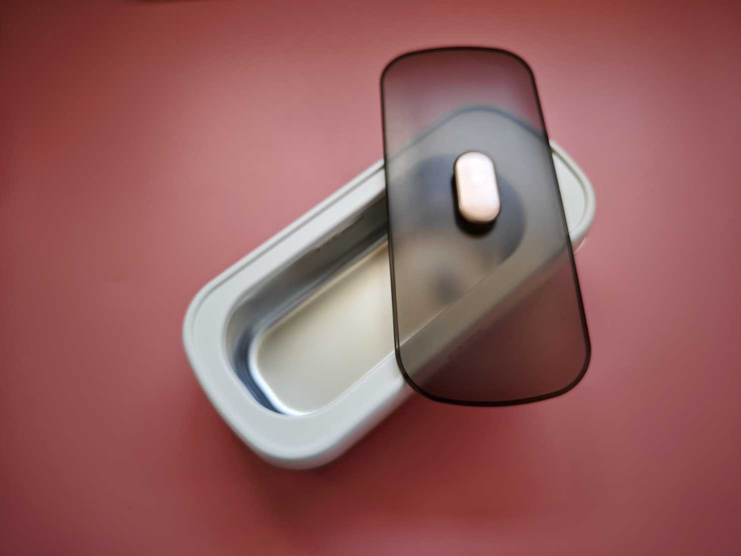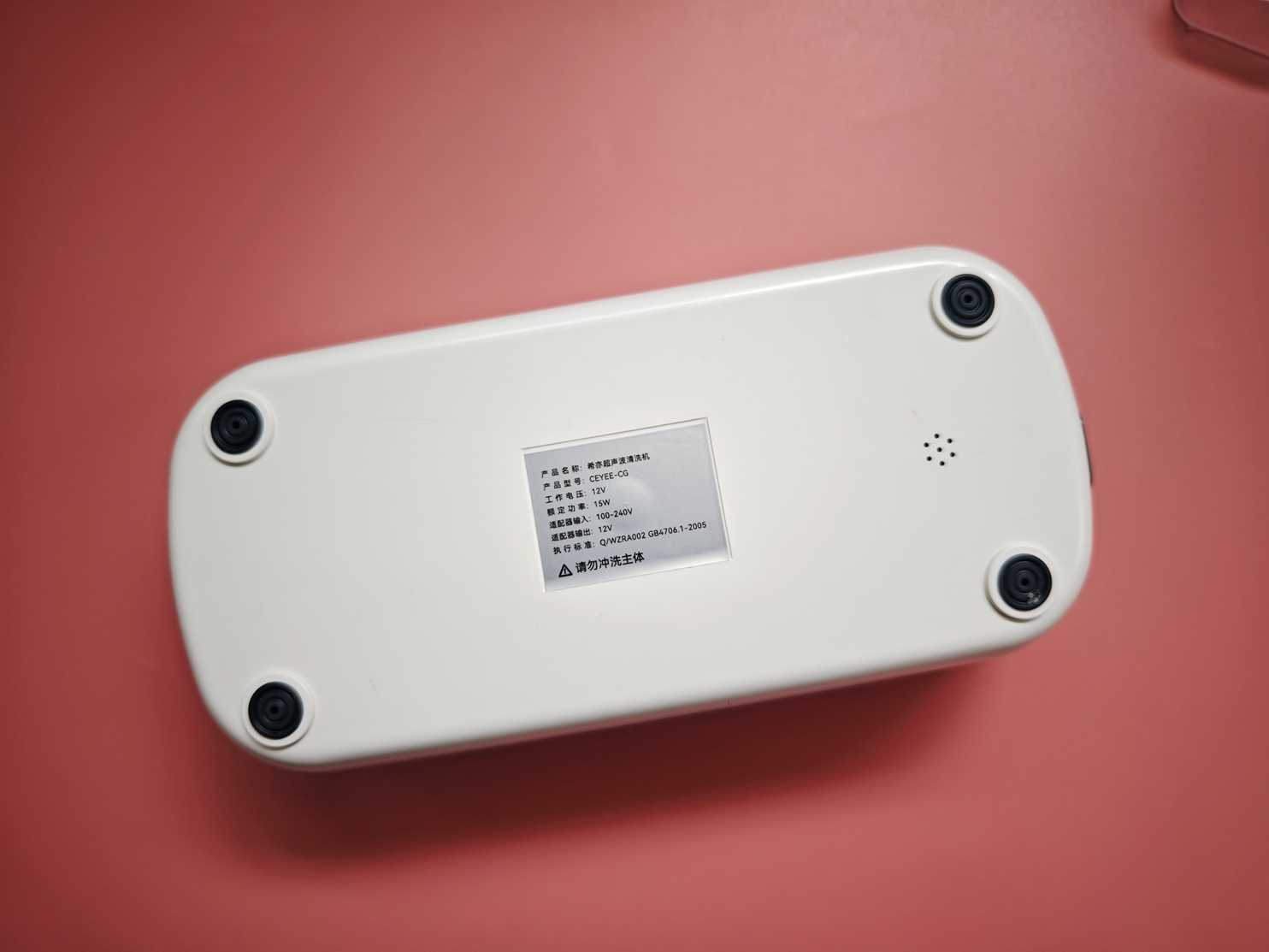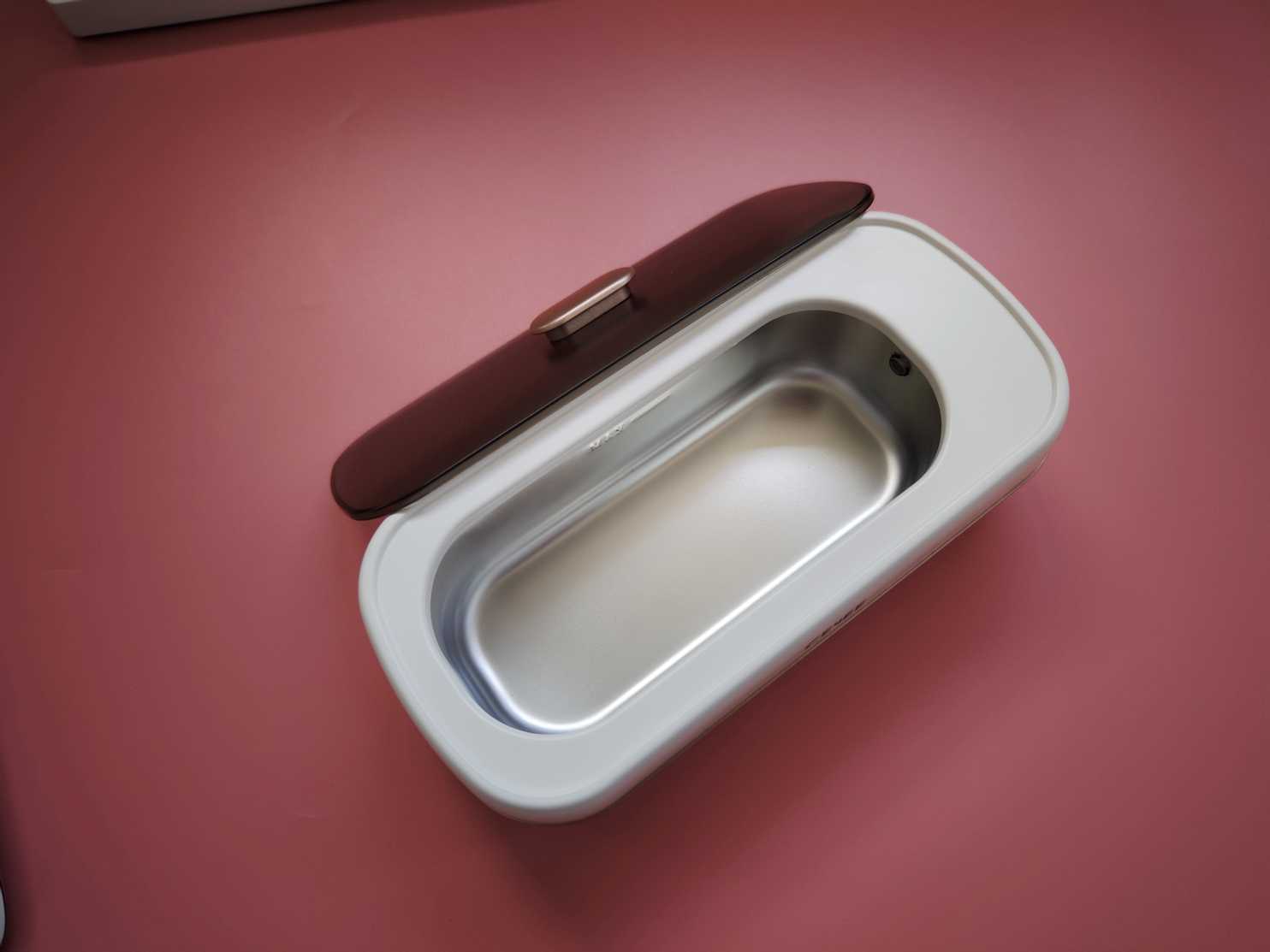 清洗机的盖子半透明磨砂黑塑料材质,清洗的过程可以大致看到里面清洗状态,有异常情况便于及时关停。内部的清洁水槽采用的是304食品安全级不锈钢,1.2mm加厚内胆,一体成型,无焊点、无缝隙,安全耐用,不用担心划伤清洗的物品。水槽的涉及容量为420ml,有最高水位刻度提示,一般的眼镜、表带、牙刷、假牙、首饰等物品都是可以放得下的。