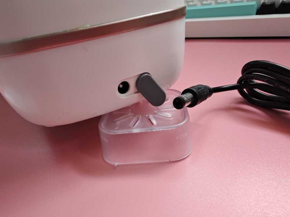 机身底部四角各有一个硅胶防滑脚垫,保证清洗机可以稳固的放置在光滑平面,减缓使用时产生的震动。正中央贴有一张印有详细参数的标签,注明了使用注意事项。靠边缘处有一个蜂窝状开孔,猜测是起散热作用吧。清洁机没有内置充电电池,也不是靠电池工作,而是采用DC12V供电,已经比较少见的圆孔插针式接口,接口处有硅胶防水垫可以封住,防止清洗时有水渗入。个人觉得这个接口能改进成Type-C接口的话,兼容性上就更完美了。