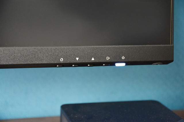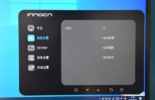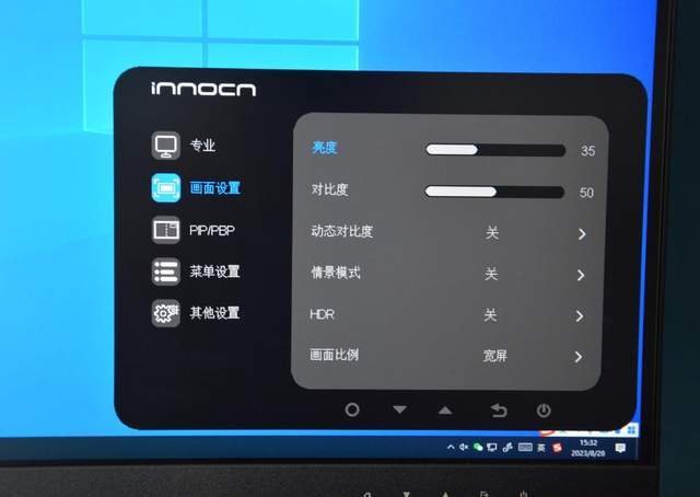 显示屏正面三边都是窄边框设计,只在下边框上居中设计“innocn”品牌logo,右边则是五个图标指示。图标下方就对应着相应的功能按键,设置时一目了然,也很方便。