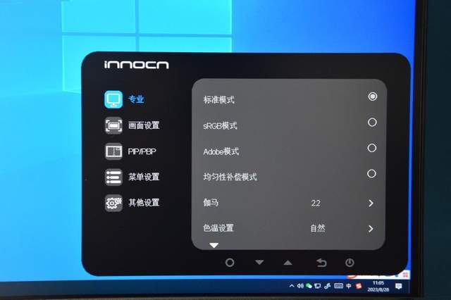 另外,专业人士或对色彩有不同习惯的用户,也可以对联合创新27C1U-D进行个性化设置。操作显示屏右下角的五个按钮,专业模块中可以自由选择标准模式、sRGB模式、Adobe模式、均匀性补偿模式,可以设置伽马、色温等。