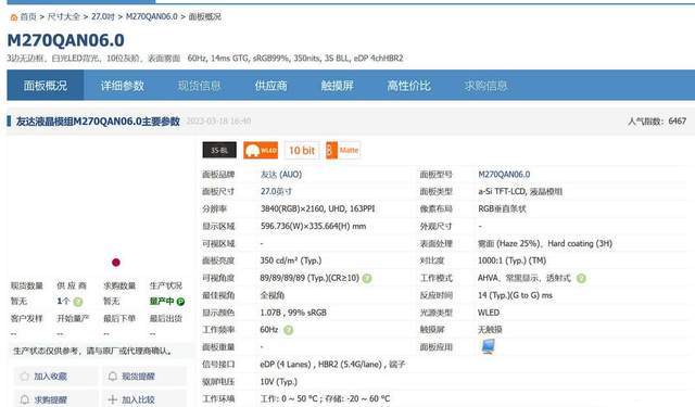 首先查询到联合创新27C1U-D采用的是友达6.0面板,面板型号为M270QAN06.0,尺寸为27英寸,屏幕分辨率3840*2160(达到了4K级别),亮度350cd/m²,刷新率60Hz,以上便是详细的参数信息。这里需要指出的是,友达M270QAN06.0面板广泛用于中高端显示器,千元出头的联合创新27C1U-D能用上这块面板,确实是很不错很有诚意的。