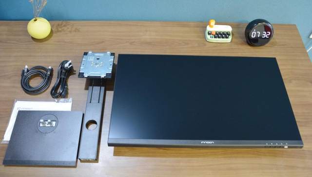 包装箱里,除了显示屏外,当然也提供有诸多丰富的配件,比如底座、支架、电源线、说明书,另外还赠送了一根DP视频线和一根Type-C多功能数据线。