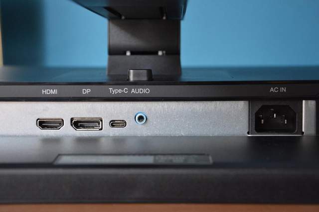 显示屏背面,在支架卡扣的下方,它隐藏安排了一众接口,包括一个HDMI接口、一个DP接口、一个Type-C接口、音响接口和三孔电源接口。值得一提的是,其中的Type-C接口支持65W快充,可直接为手机等设备供电,很实用。