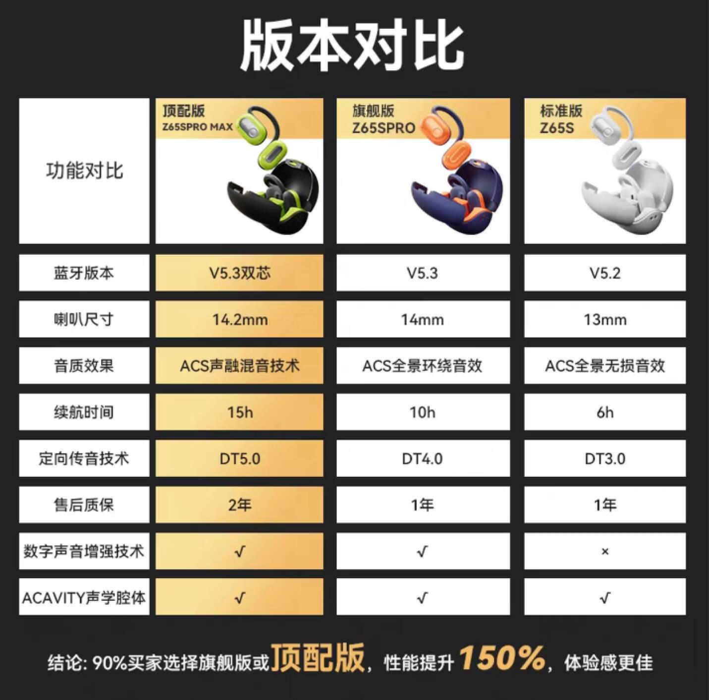 说起塞那可是央视购物推荐的品牌,由孔令微、何宁、孙瑜三位世界冠军作为品牌形象大使,曾经获得MUSE缪斯国际奖、巴黎DNA设计奖和伦敦设计奖三项国际大奖,之前也推出过不少耳机产品,市场反映不错,这次推出的Z65开放式不入耳蓝牙耳机,有标准、旗舰和顶配三款配置,主要是音质效果的差别,区别见下图: