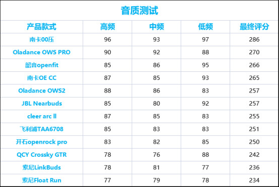 其次韶音openfit和南卡OE CC表现分别是266和265分,排名也属于前列。