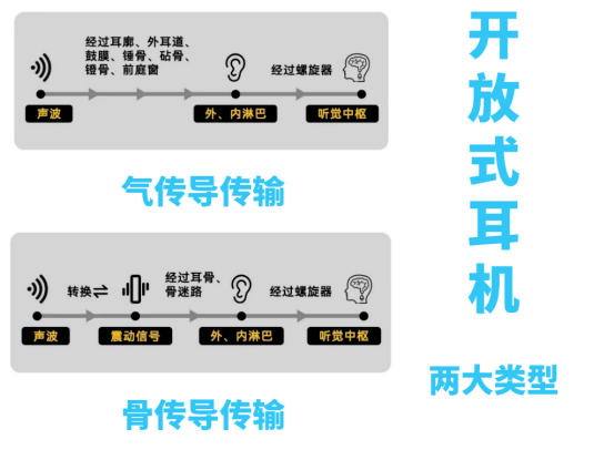 开放式耳机与一般耳机最大的区别就是无需塞入耳朵,佩戴舒适自在,长时间使用不易疲劳。而开放式耳机主要分为气传导式和骨传导式两大类型。