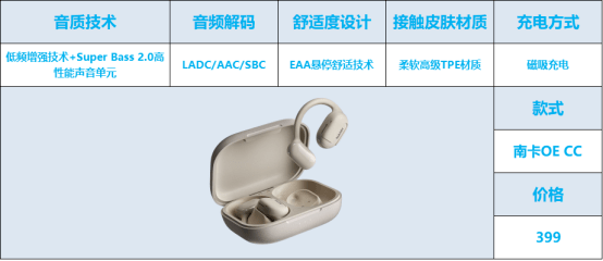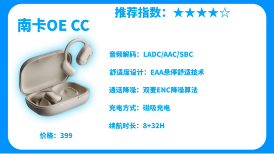 南卡OE CC尽管在这些开放式耳机中定价最低,但使用体验可以媲美许多千元级产品,性价比非常高。它拥有南卡专业的音频技术支持,以及丰富的开放式耳机调音经验。在音质和佩戴舒适性方面表现优秀,是预算在1000元以下的用户的必选选择。OE CC证明了南卡在开放式耳机领域的实力,以极高的性价比征服众多预算用户。