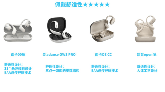 这四个款式是目前佩戴体验最佳的款式。南卡00压在双重的佩戴设计加持下,加上液态硅胶材质,佩戴体验相当舒适无感,并且牢固性也高。OWS PRO和韶音的佩戴舒适性也相当不错,但是稳固性并不是很好,如果是小耳朵的话,会比较容易掉落。