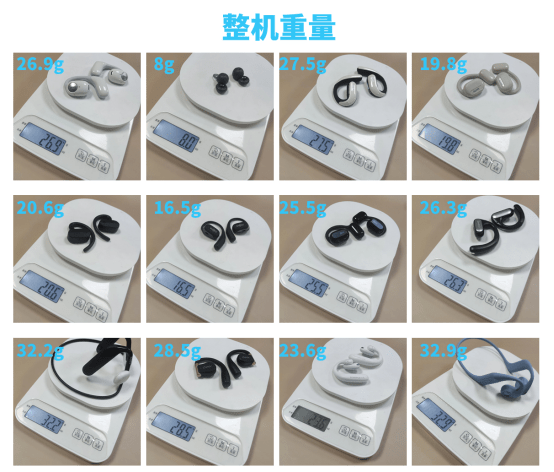 重量一般:南卡00压(26.9g)、Oladance OWS PRO(27.5g)、飞利浦TAA6708(20.6g)、Oladance OWS2(25.5g)、开石openrock pro(26.3g)、QCY Crossky GTR(23.6g)