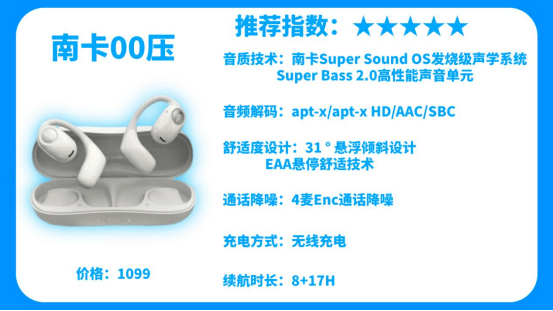首先,如果预算足够,我首推这款南卡00压开放式耳机,它是今年的“真旗舰”,各方面可说是配置拉满,不仅佩戴舒适性很高,音质也非常出色,配置全面,可以说购买完全不会亏。