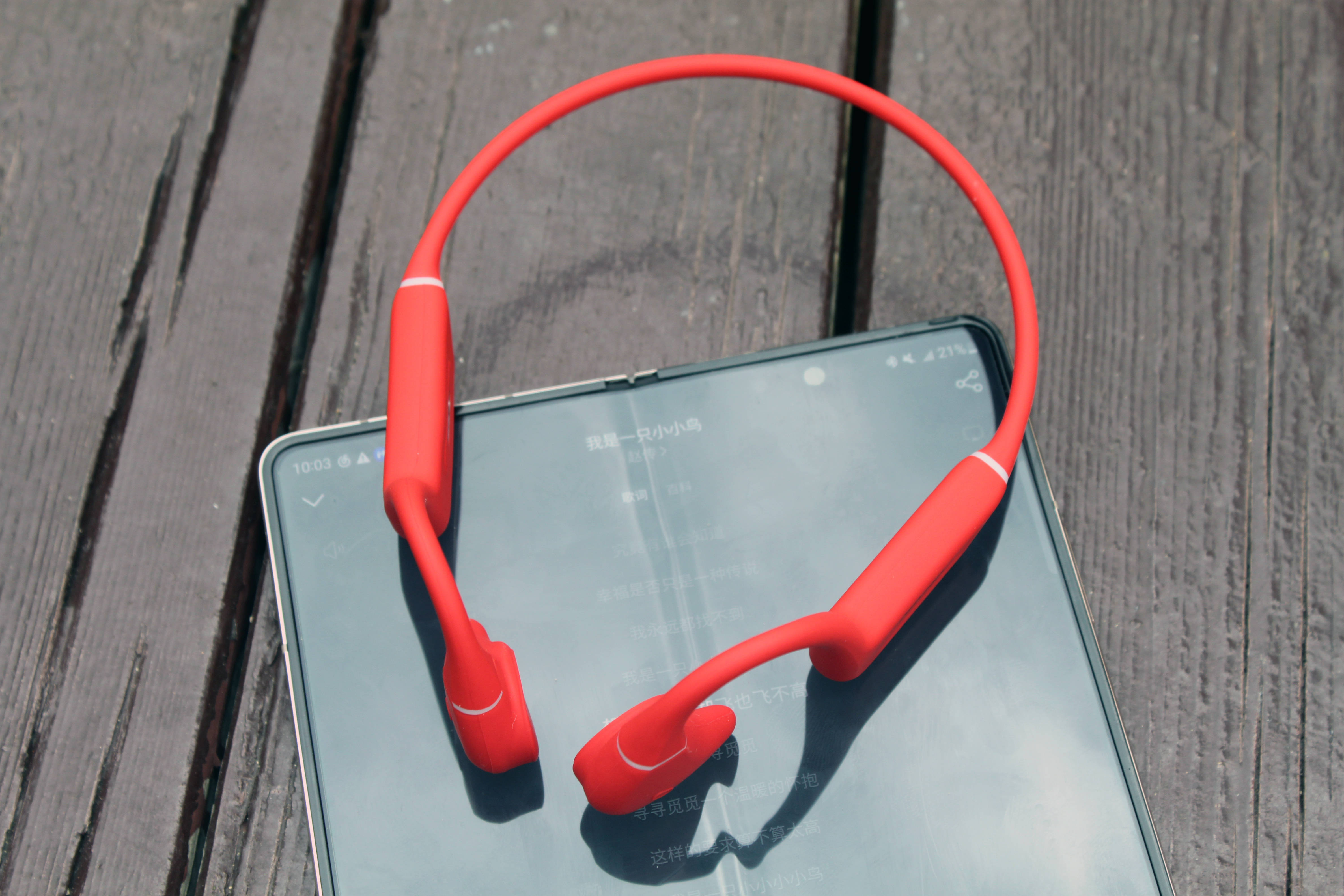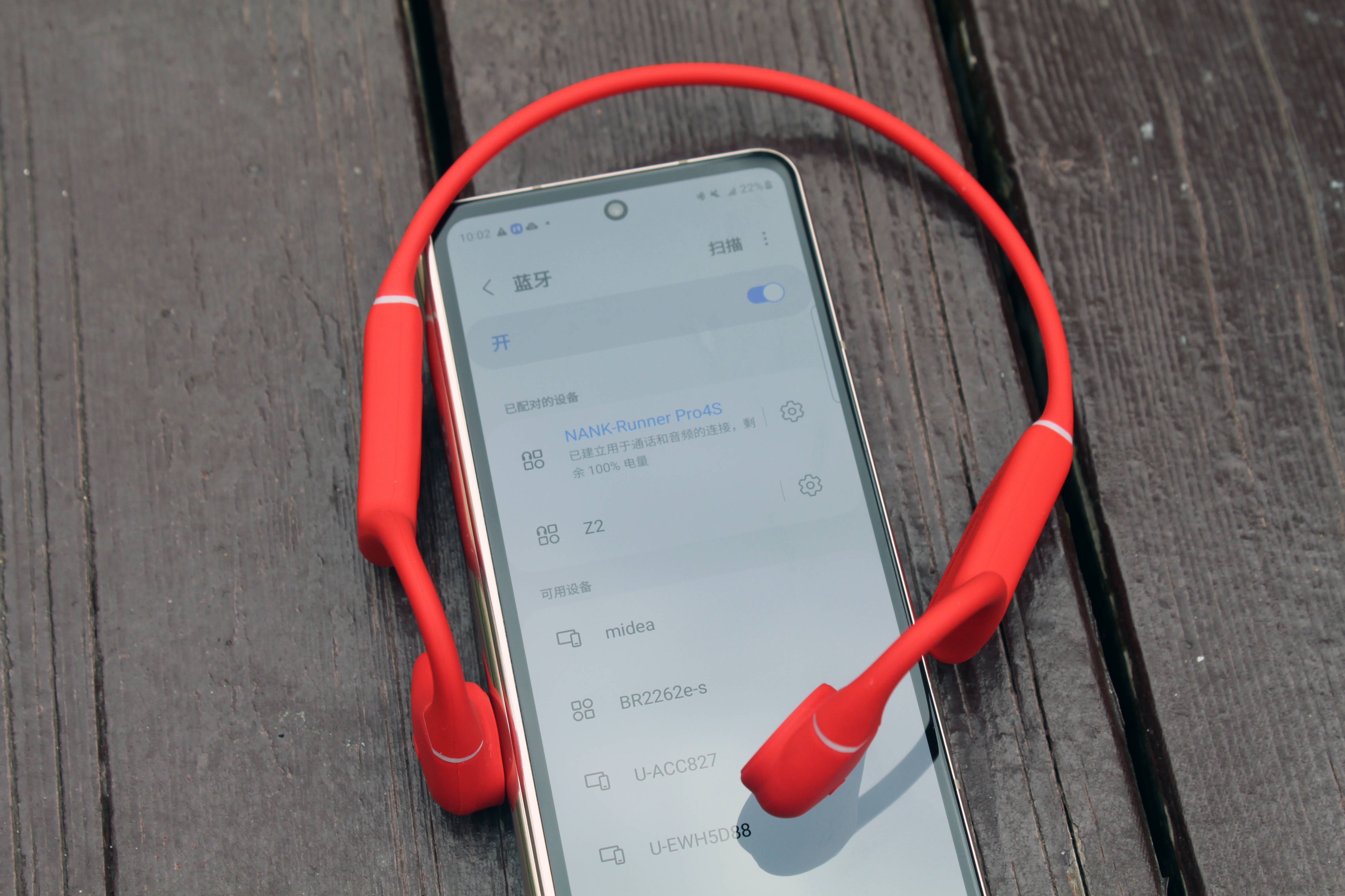 把南卡Runner Pro 4S骨传导耳机与智能设备连接好后,就可以佩戴使用了,耳机整体比较轻质,佩戴时比较舒适,也没有负重感。同时耳机也内置了32GB的内存,即使不与智能设备连接也可以进行听歌体验,这样减少了运动时耳机对智能设备的依赖。