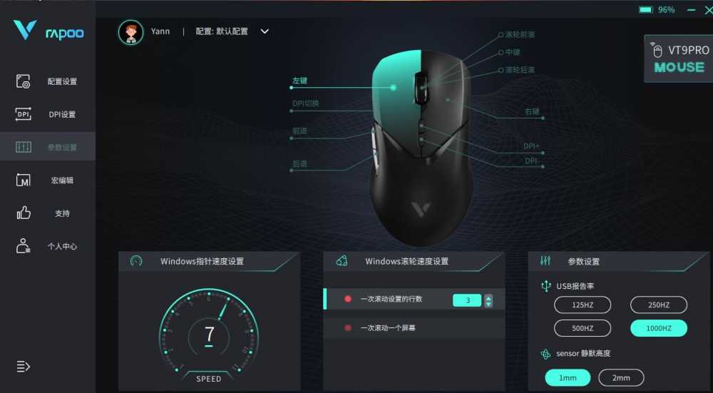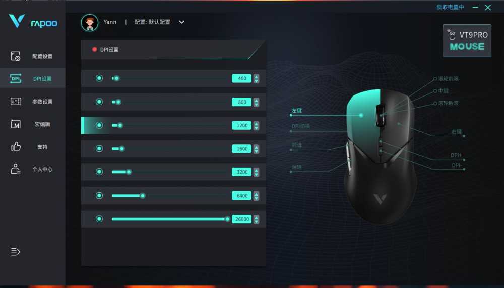 通过RapooGameDev,我们就可以进入系统,对鼠标进行更多设置,包括:配置设置、DPI设置、参数设置、宏设置等主要部分。