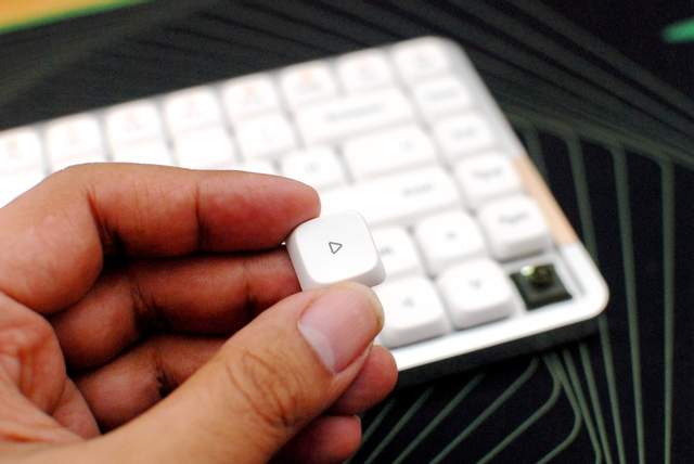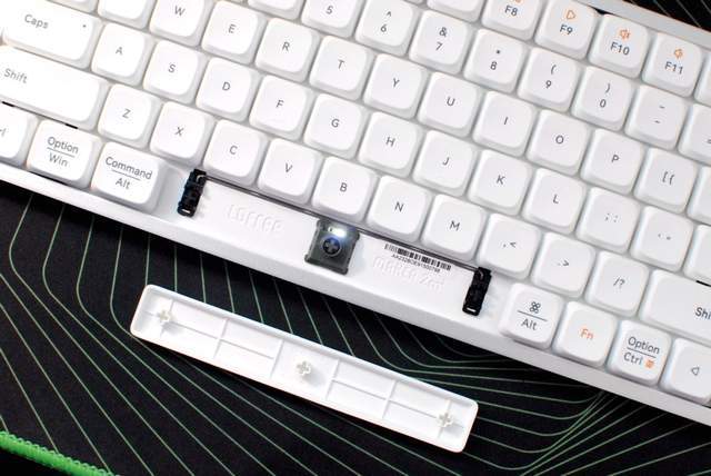 Lofree洛斐小顺的空格键展示,和传统卫星轴的设计区别不大,但细节做得更好,按压时一致性的手感不错,反馈也很明显,只不过回弹略有点肉,没有传统机械键盘那么爽脆,但总体还是可以接受的。