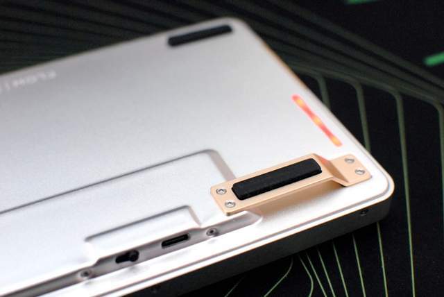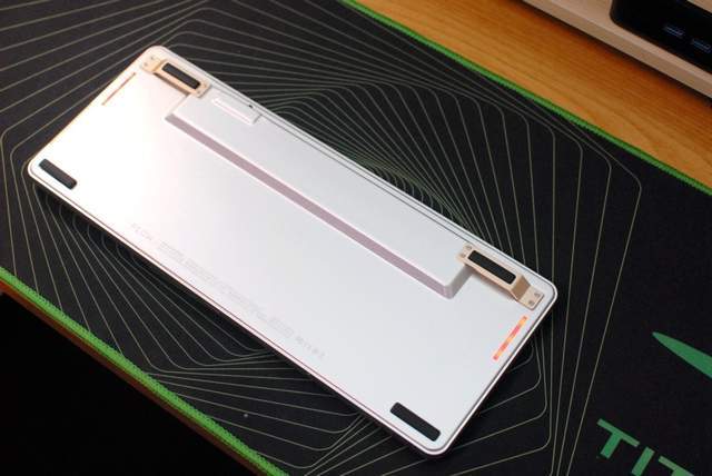 众所周知金铝金的底部不能再像其他机械键盘一样设计分段式脚撑,所以为了提高键盘使用时的舒适度,设计师在底板与高处的位置搭了个桥作为脚撑,完美的解决了提高角度的需求,不得不说创意与创新Lofree洛斐是可以的。