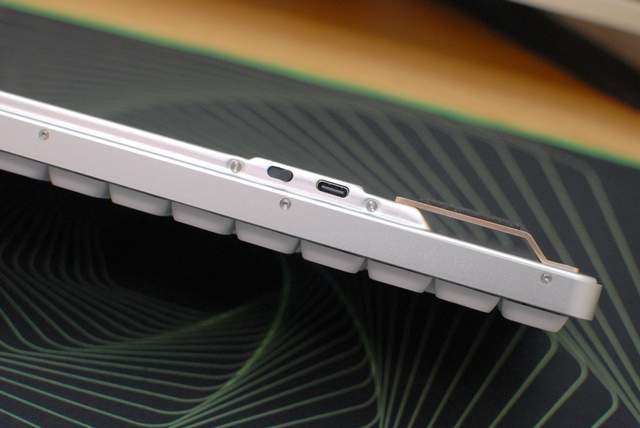 Lofree洛斐小顺的电源开关和充电接口,这款键盘为双模设计,可蓝牙,也可通过数据线使用,所以在连接方面还是挺简单的。另外,Lofree洛斐小顺内置了2000mAh的锂电,满电的情况下可提供6~8周的使用时长,使用非常省心。