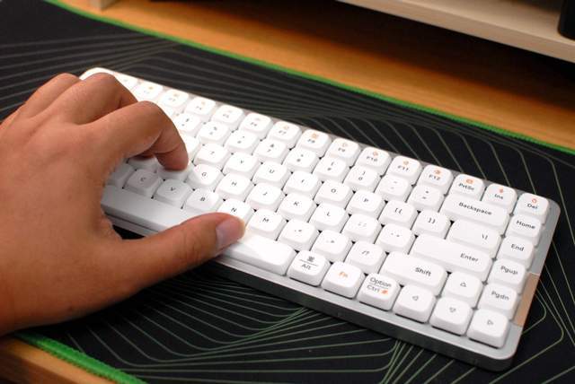 至于手感方面,没有青轴般清脆,但直上下落感很明显。另外,虽然Lofree洛斐小顺是紧凑型的键盘设计,但指间还是很宽裕的,并不有局促的感觉,而且向上略翘的设计,腕部也能得到很好的支撑,久打不累。