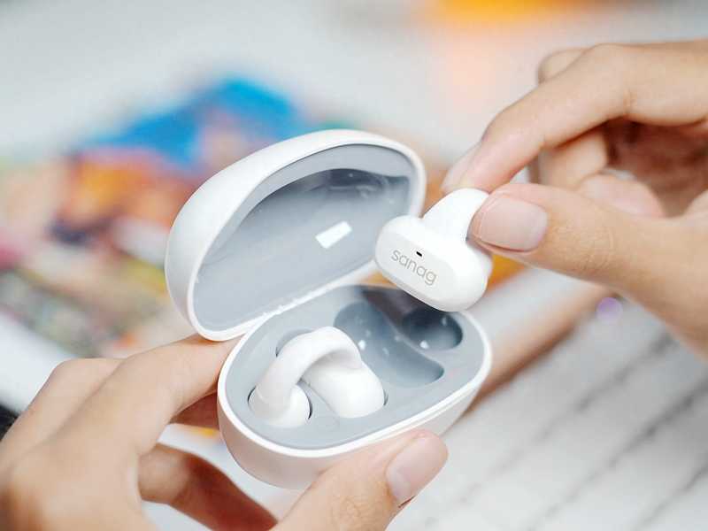 从造型来看,sanag塞那Z50 AI Max与常见的TWS耳机没有多大的差别,但它的佩戴方式和出声方式却有着大不同。常见的TWS耳机大多采用侧导入耳、半耳设计,固然能够带来不俗的物理降噪效果,可在使用一段时间后很容易出现耳道闷热、出汗感,耳朵老感觉湿哒哒地非常不舒服。