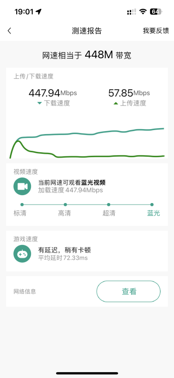 再到卧室看看,以前这里是最揪心的,我先选择了不放子路由,测速448Mbps,已经超出了我的预期,不得不说锐捷蜂鸟旗舰版的5颗独立FEM芯片真不是吹的。