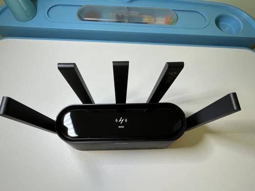 母路由主体是磨砂质感的黑色,顶部感应区采用了钢琴漆一般的亮黑,看上去科技感满满。5根外置四振子天线矗立在主体之后,搭配金色的wifi6标识,放在桌上就有一种霸气。