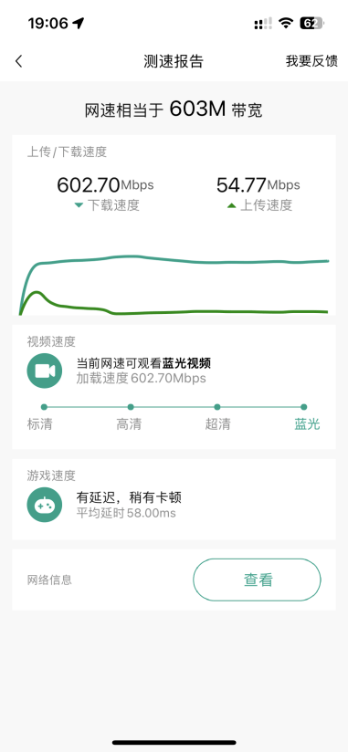 随后我接通了子路由的电源,3分钟后在卧室再次测速,指针一下就飞向了500,最终测速603Mbps,这个数字可以说是惊呆我了!真的有点不敢相信这是无线Mesh组网的效果。