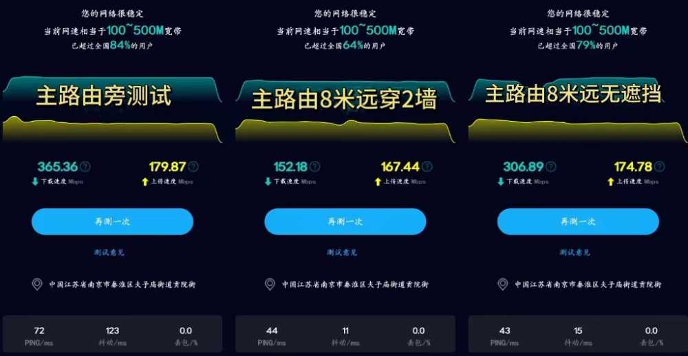 主路由器测速条件为近距离测速,实测下载速度为365.36Mbps,隔着亮度墙的8米开外实测下载速度为152.18Mbps,这个穿透性大家可以自行脑补一下。不隔墙8米开外实测下载速度为306.89Mbps。三种条件下上传速度基本没有明显的变化。因为我家是上下两层,所以我试了不同楼层隔着两堵墙依然是秒连接,满格信号,看在线视频玩游戏一点卡顿都没有。顺畅度没有明显的感觉。