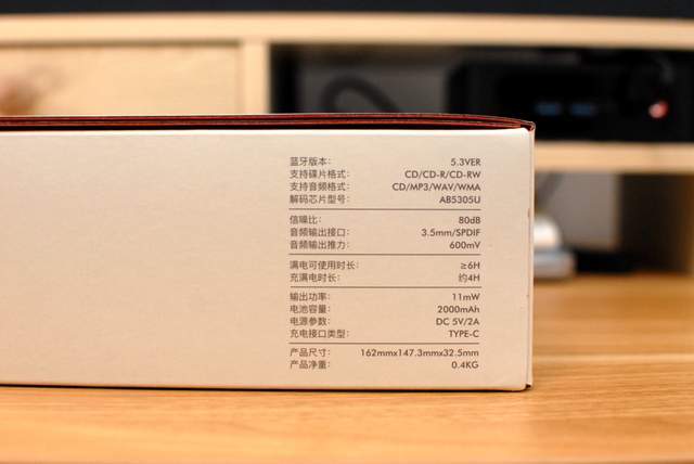 赛塔林CD播放机R300的硬件参数,我们挑一些重点来看看,产品支持的碟片格式有CD/CD-R/CD-RW,音乐格式有CD/MP3/WAV/WMA,音频输出接口有3.5mm/SPDIF,电池容量为2000mAh,满电可使用时长约6小时左右,充电用时约4小时。对了,产品的尺寸为162x147.3x32.5mm,净重0.4kg,其实还是挺轻便的。