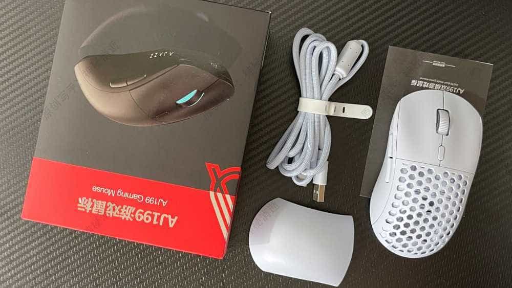 ▲鼠标的全部配件于此,除了鼠标本体外,还有使用说明书、同色系柔软伞绳数据线(长度约1.5米)、无线接收器(收纳于鼠标内部)、替换后盖、鼠标防滑贴以及替换脚垫,附件丰富且实用性很强。