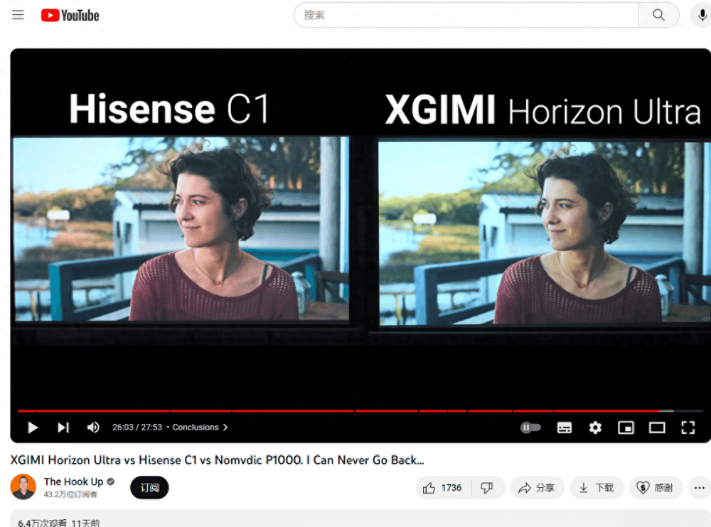 近日,国外科技博主The Hook Up对多款智能投影进行了全方位对比评测。其中画质部分对比结果显示,海信推出的三色激光投影在画质方面全面领先,大幅优于极米RS PRO 3混光投影的海外版XGIMI Horizon Ultra。同时,博主通过参数对比后推测海信这款三色激光和国内的Vidda C1S在参数上非常接近,可以认定为硬件完全相同,软件系统和内置网络资源则完全不同。