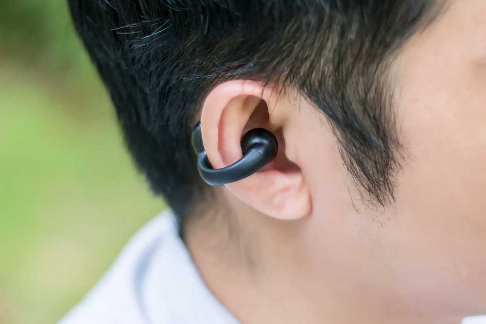 蓝牙耳机在佩戴稳固性相当出色,可以很牢固地固定在耳朵上,发声单元刚好卡在耳廓的凹陷处,相当稳固即使是上下跳跃也不会位移,另外,耳机佩戴时不需要进入耳道,意味着不会堵塞耳道,尤其是很适合在运动场景下佩戴,可以尽情运动的同时保持舒适稳固的佩戴体验,不用担心在激烈的运动过程中耳机突然掉落,在佩戴时也可适当地向下调整位置,让发声单元更为靠近耳道提高听音感受。