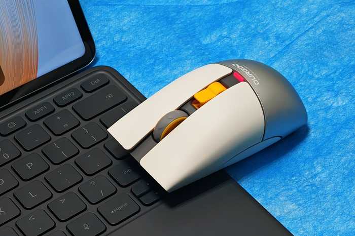 滚轮上方的DPI调节键可以说是鼠标的点睛之处,醒目的亮黄色不但提升了鼠标的整体颜值,而且操作方式与众不同,需要上拉才能切换DPI档位,长按则是进入配对模式。杜伽Hi Click支持600/1000/1500/2400四档DPI调节,能够满足不同用户对于鼠标移速的需求,很好的兼顾了办公、设计、游戏等不同的应用场景使用。
