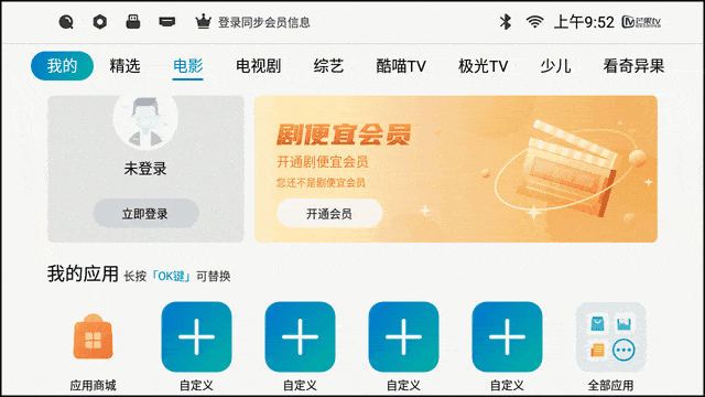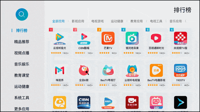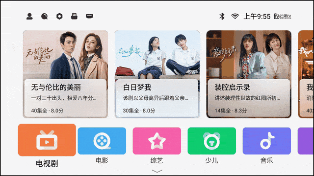 内容资源方面和智能电视的界面大同小异,主页面上涵盖了目前主流的电影、电视剧、少儿、综艺、体育,以及酷喵TV、极光TV、奇异果等各种频道,平滑流畅的交互模式和清晰简洁的分类管理,可以让我们轻松获取想要的内容。