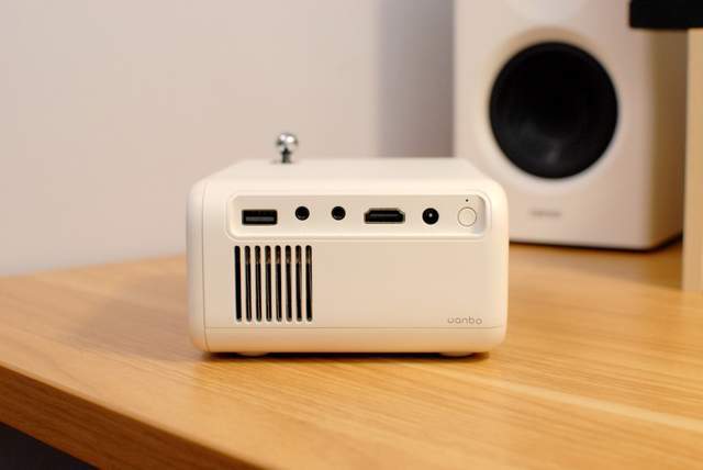万播Mini的左侧面是各种接口和散热格栅,接口方面从左到右分别是USB接口、耳机接口、AV接口、HDMI接口、电源接口和开机键,和千元以上的同类产品差不多,该有的配置一个都不少,这点还是挺厚道的。至于散热方面,万播Mini内置了2个风扇+真铜散热鳍片,搭配NTC智能控温系统,可以保证带来高效散热,让投影仪工作更稳定。