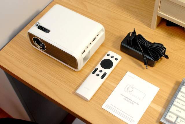 包装内的物件展示,除了万播Mini之外,还有遥控器、电源适配器和说明书,这些都是投影仪的基本配置。