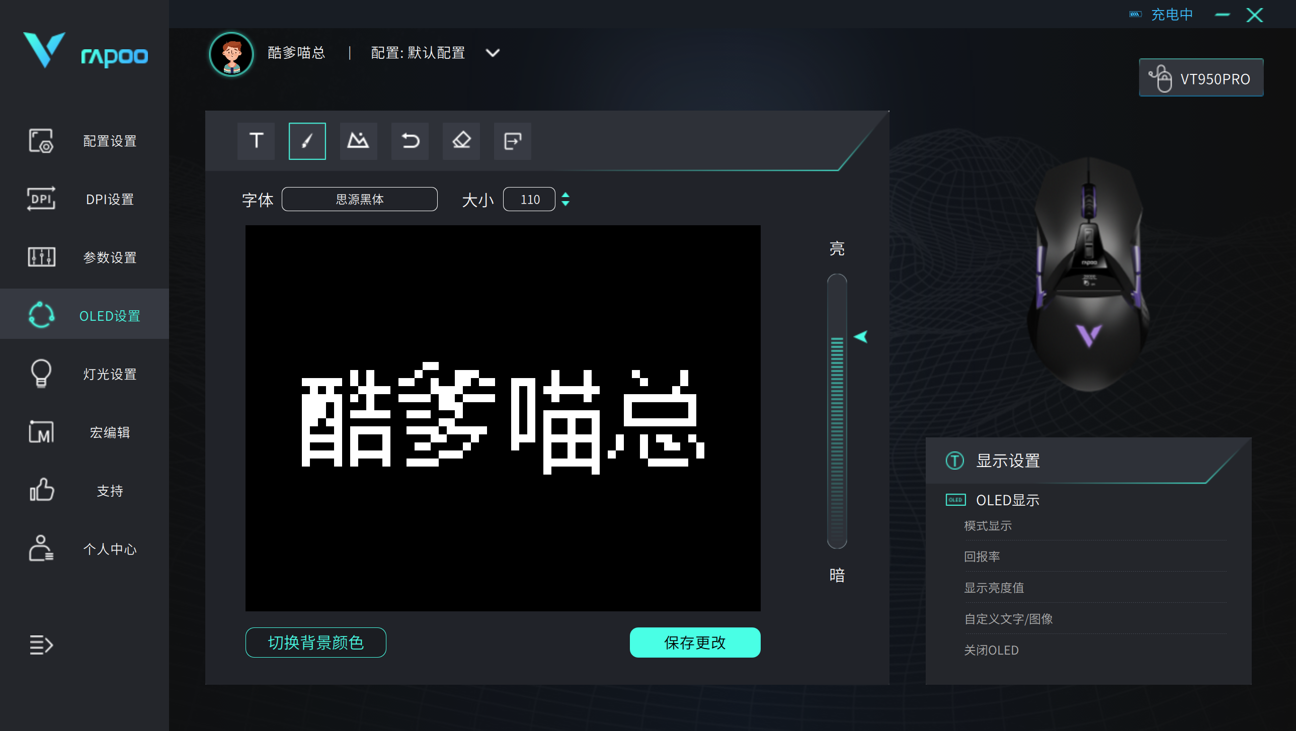 VT950 Pro的灵魂还是在背部做了镂空下陷设计,并配上了一块0.66英寸的小屏幕,虽然分辨率不高,但支持丰富的客制化玩法,支持自定义文字、图片的互动,也能实时显示DPI等参数,好玩又实用。但是黑色镜面真的很沾灰,免不了费心打理。