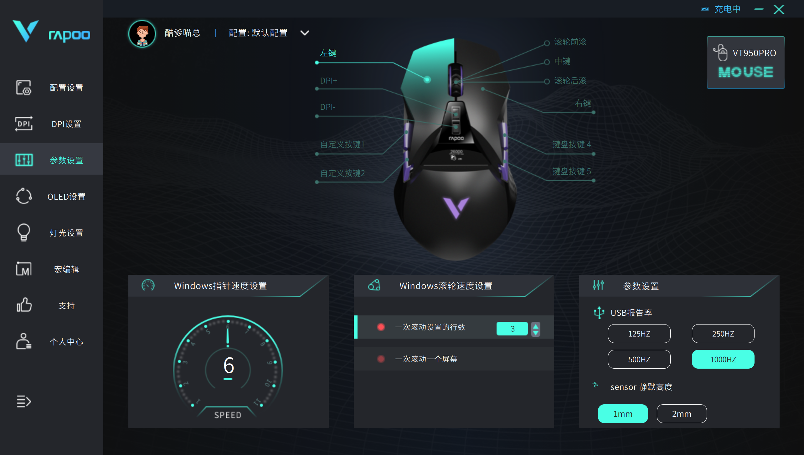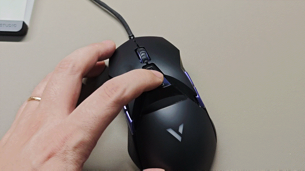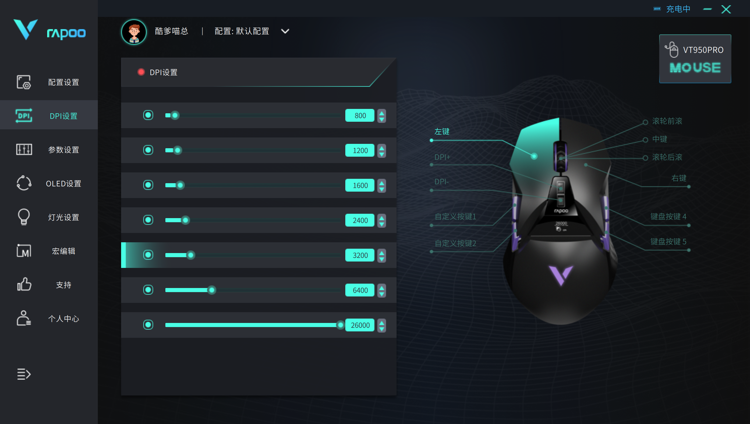 VT950 Pro采用的原相3395光学引擎支持50-26000DPI灵敏度调节,上限和下限相当于很多普通鼠标的8-10倍,预设7档固定DPI,可以通过背部的两颗DPI按键进行增减调节。