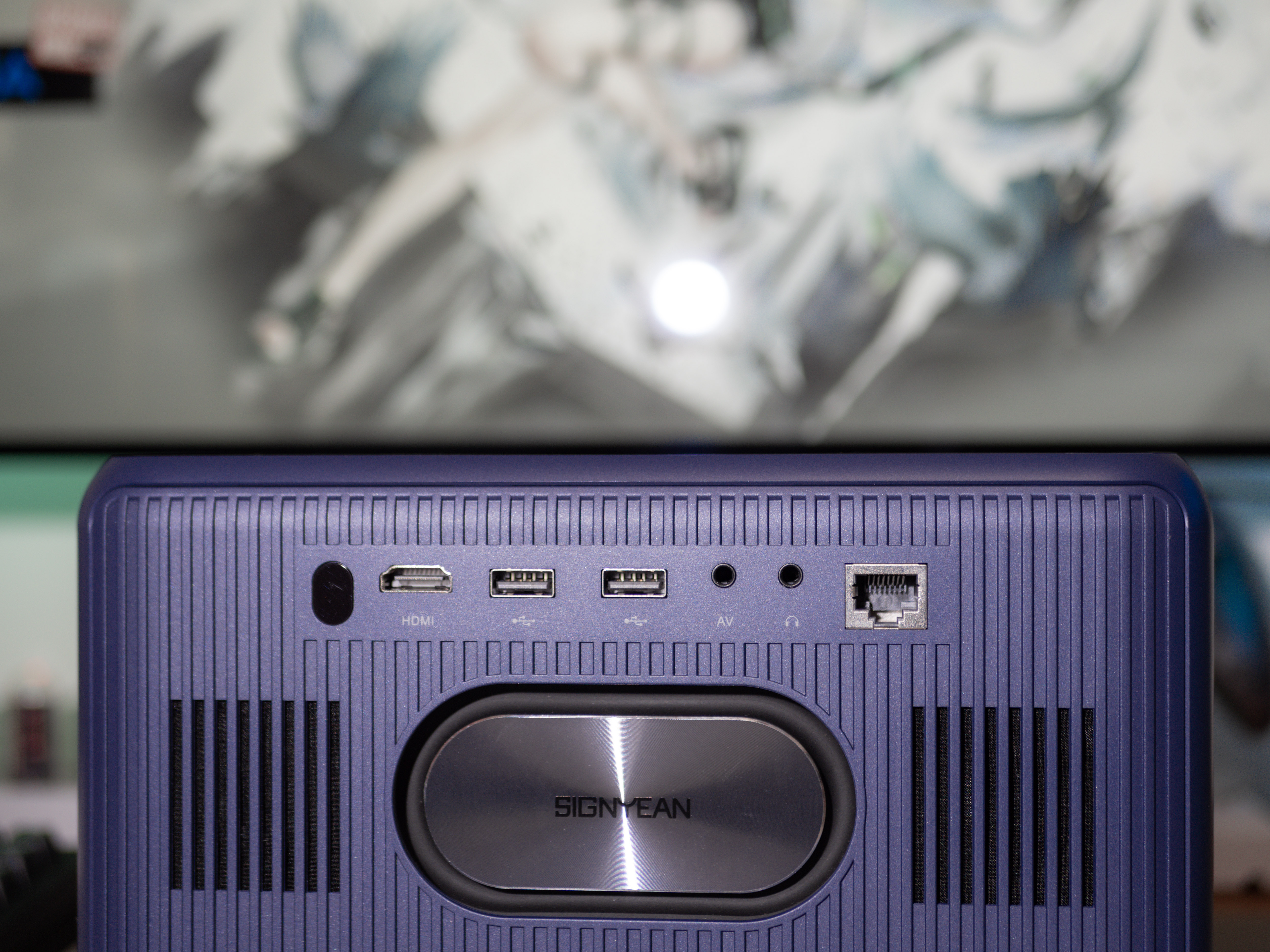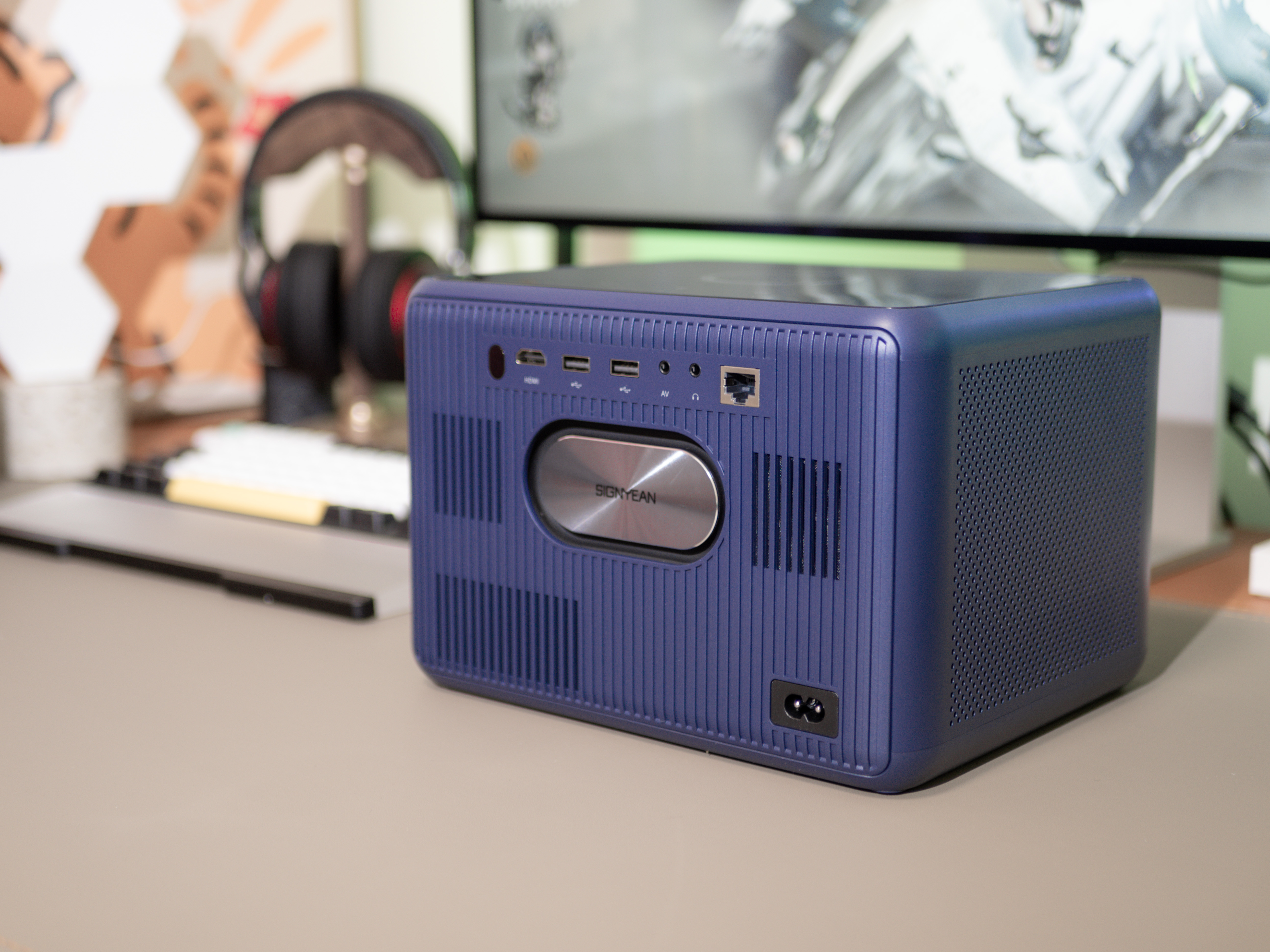 有段日子没接触过投影仪了,现在这些产品在造型上也是有了很大的变化,希影H9 Max整体方正像个小宝箱,蓝黑搭配看上去低调又不失活力,这个机身的蓝色甚至有点偏紫色,而且随机附赠一条HDMI连接线。