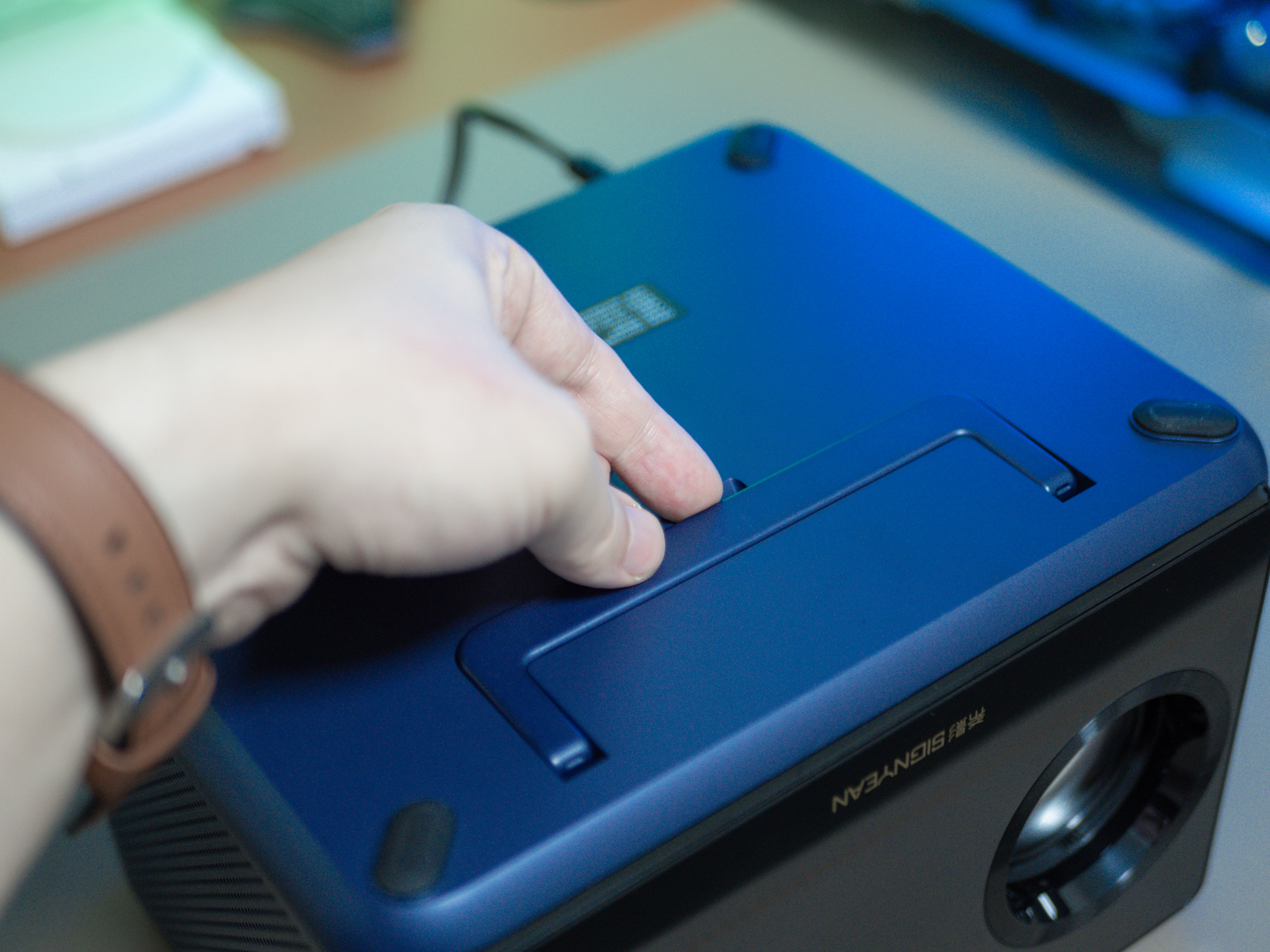 底部预留了可调节支架,可以兼顾到正放正投的高度、角度调节,也有利于风道散热。