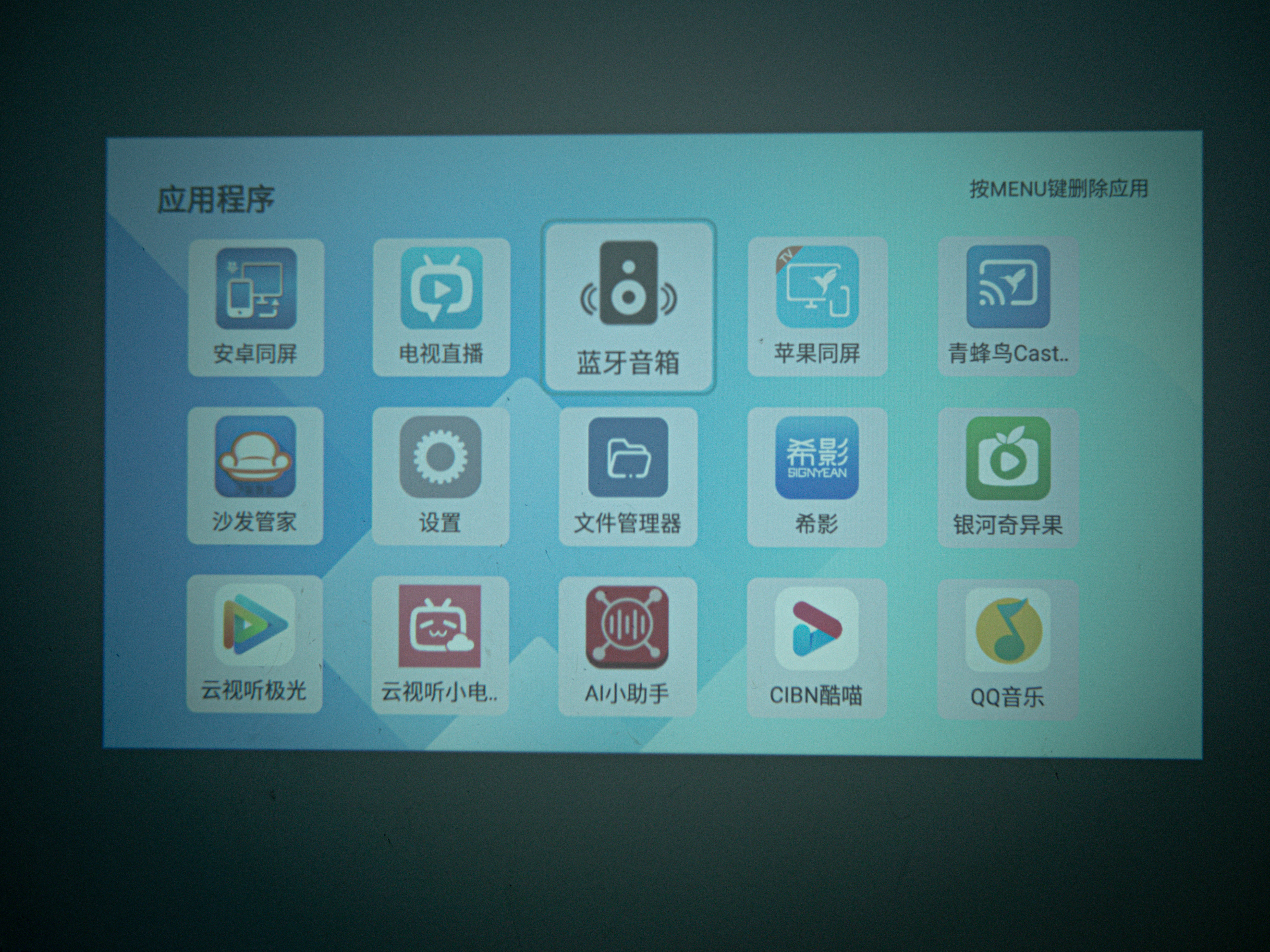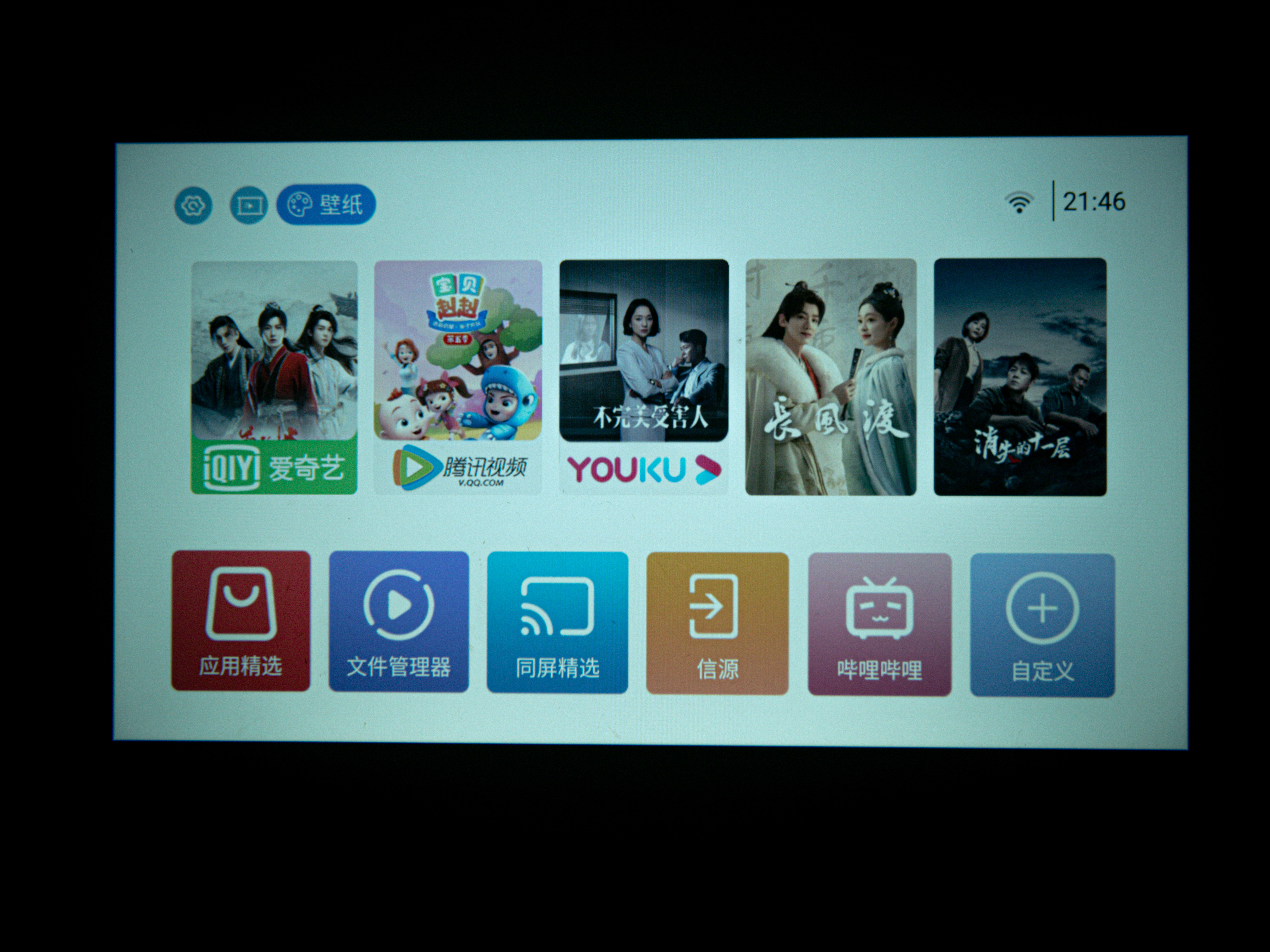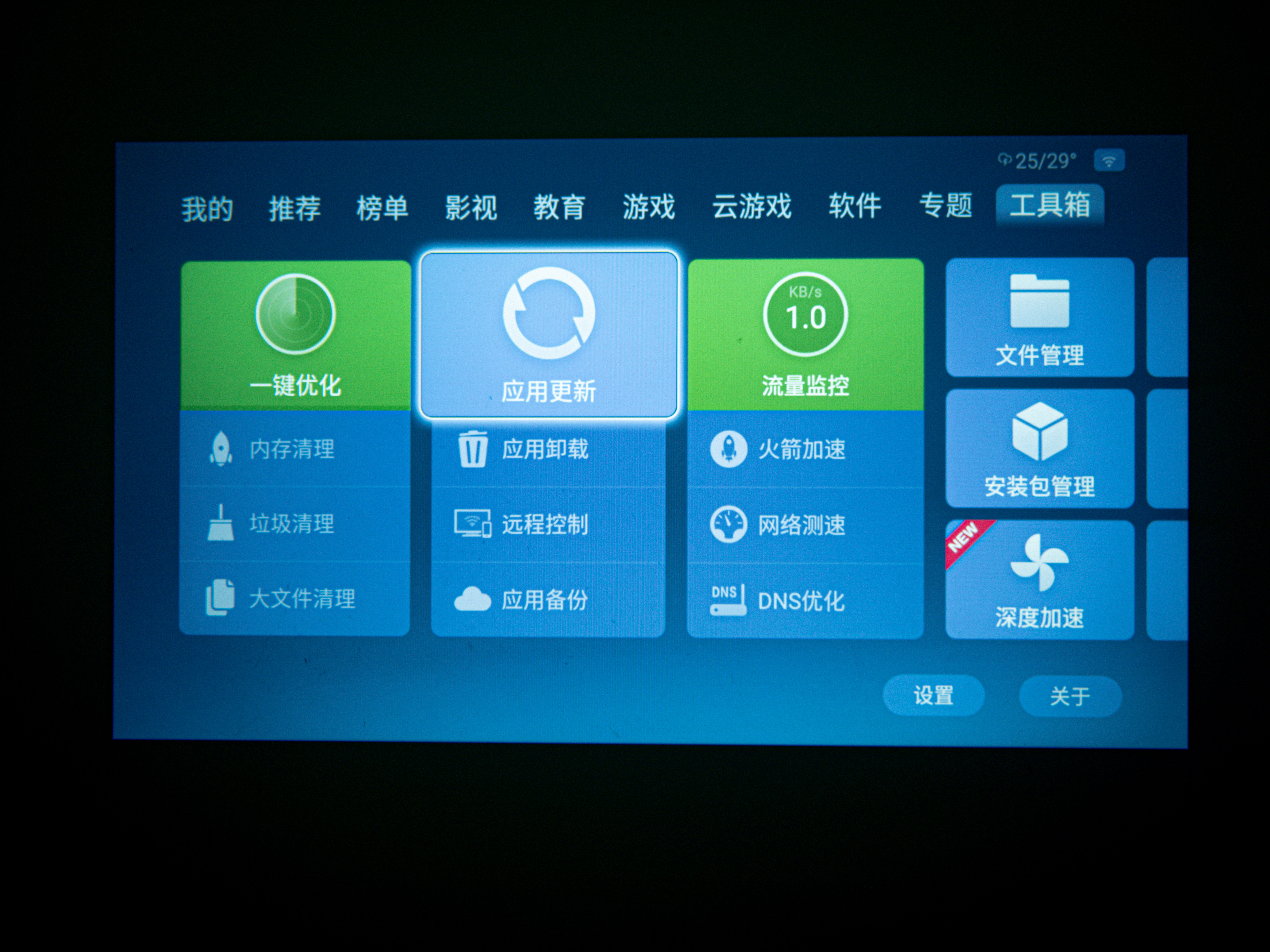 也内置了系统管理工具箱,方便进行一些系统优化和文件、应用管理,2Gb运存+32Gb存储的组合对于投影仪来说足够了,给了用户充分的开放性和个性化选择。
