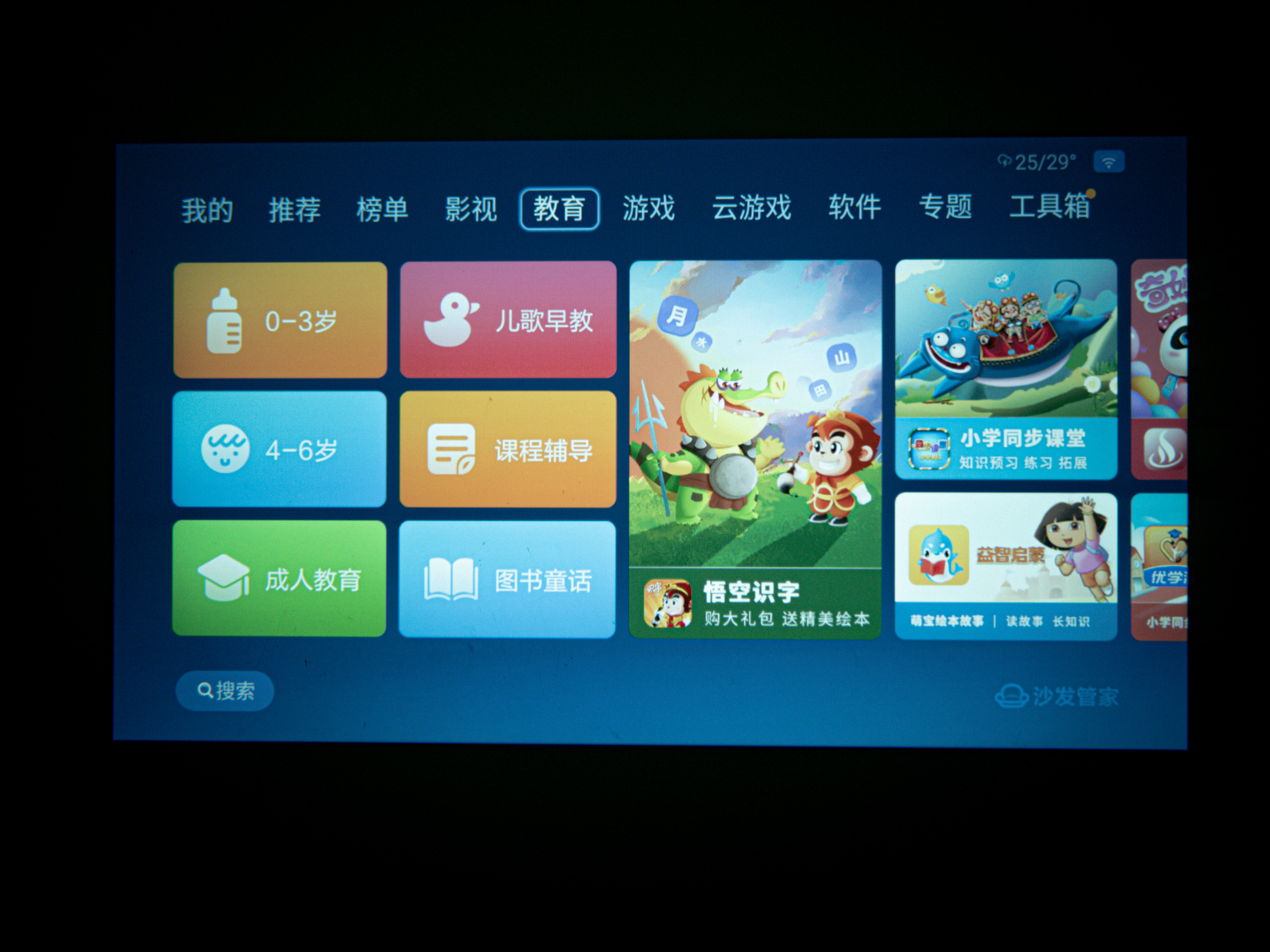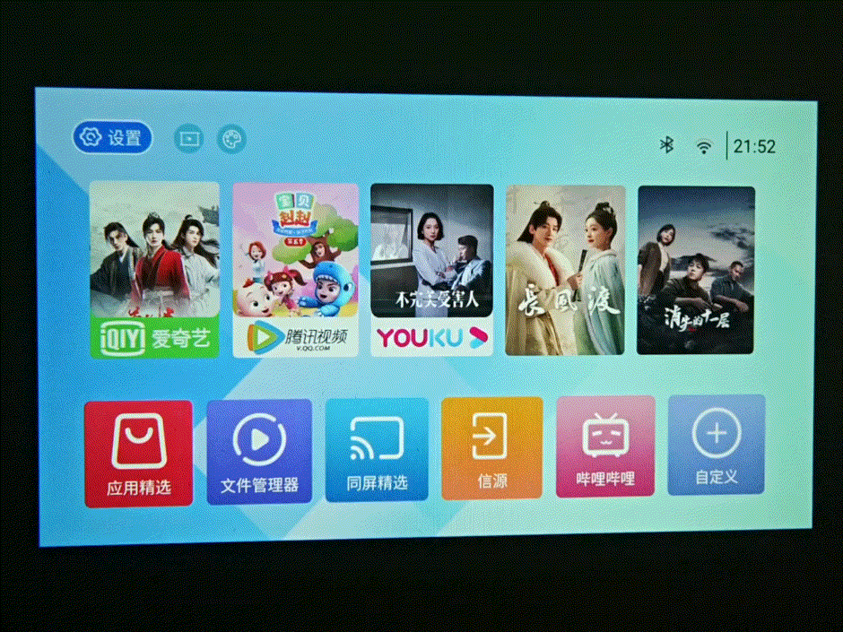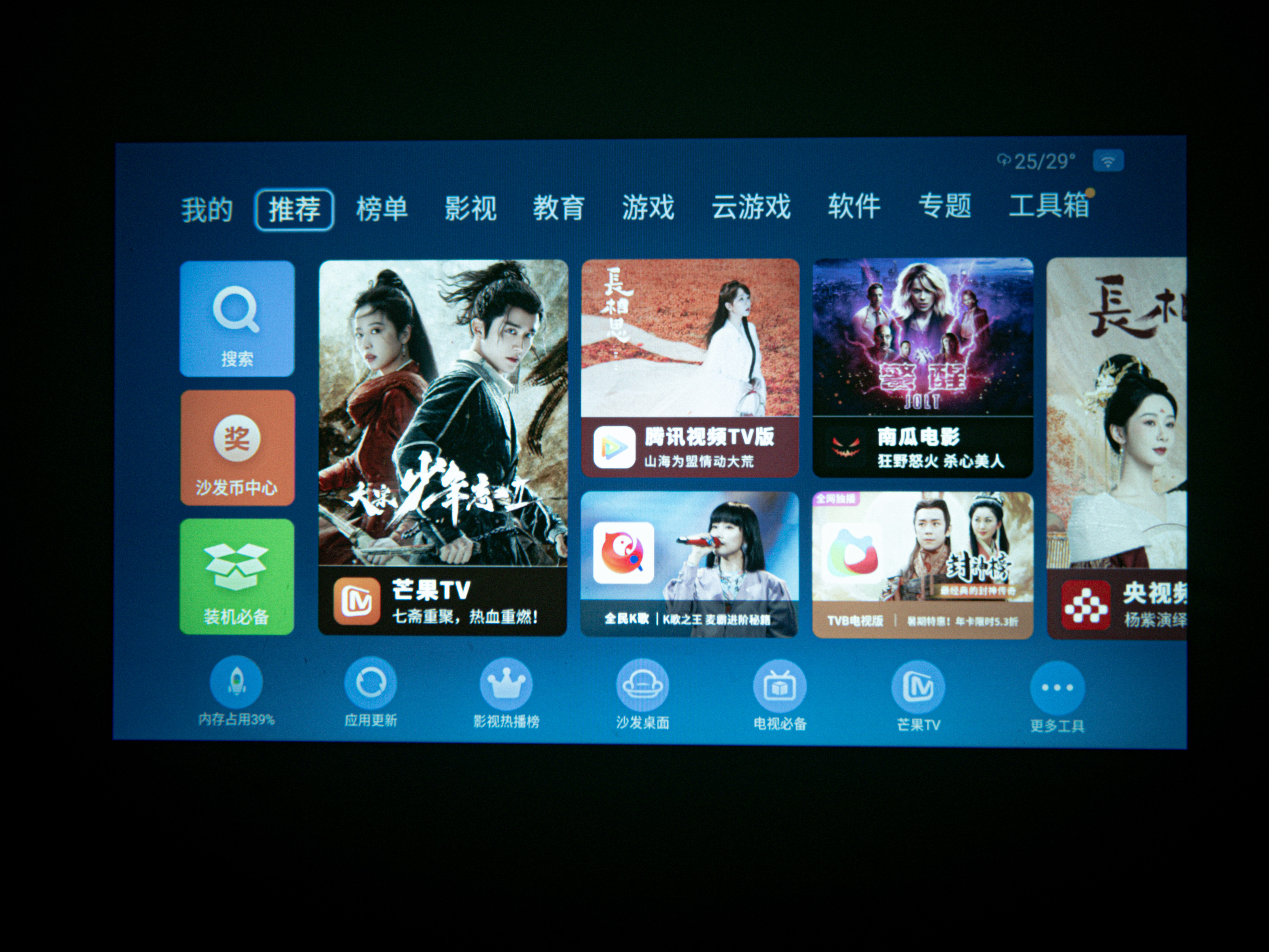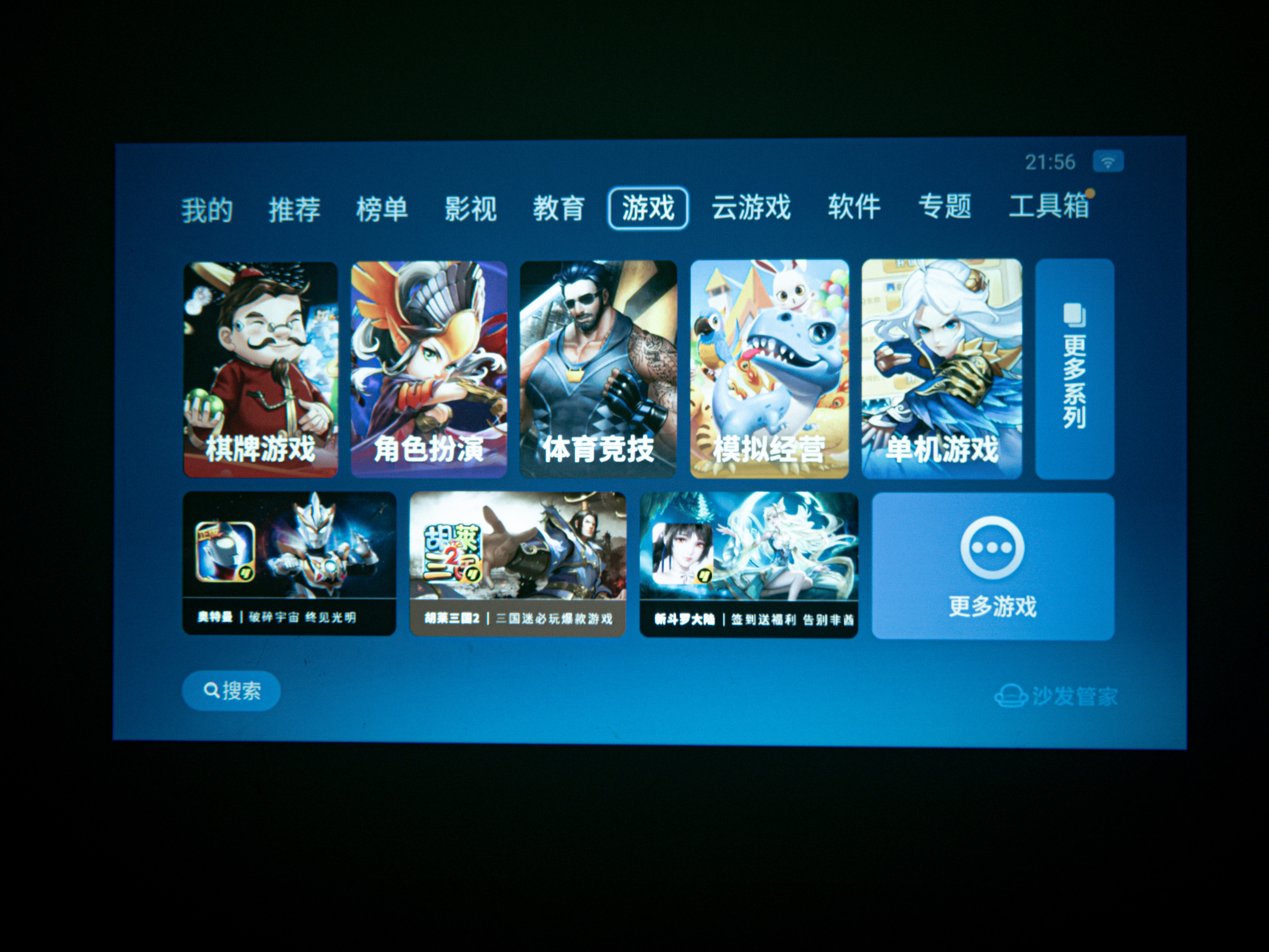 也内置了系统管理工具箱,方便进行一些系统优化和文件、应用管理,2Gb运存+32Gb存储的组合对于投影仪来说足够了,给了用户充分的开放性和个性化选择。