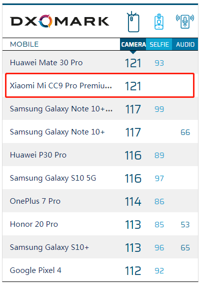值得一提的是,在发布会上雷军表示小米CC9 Pro在DxOMark上拿下了121分的总成绩,与华为Mate 30 Pro并且排名第一。
