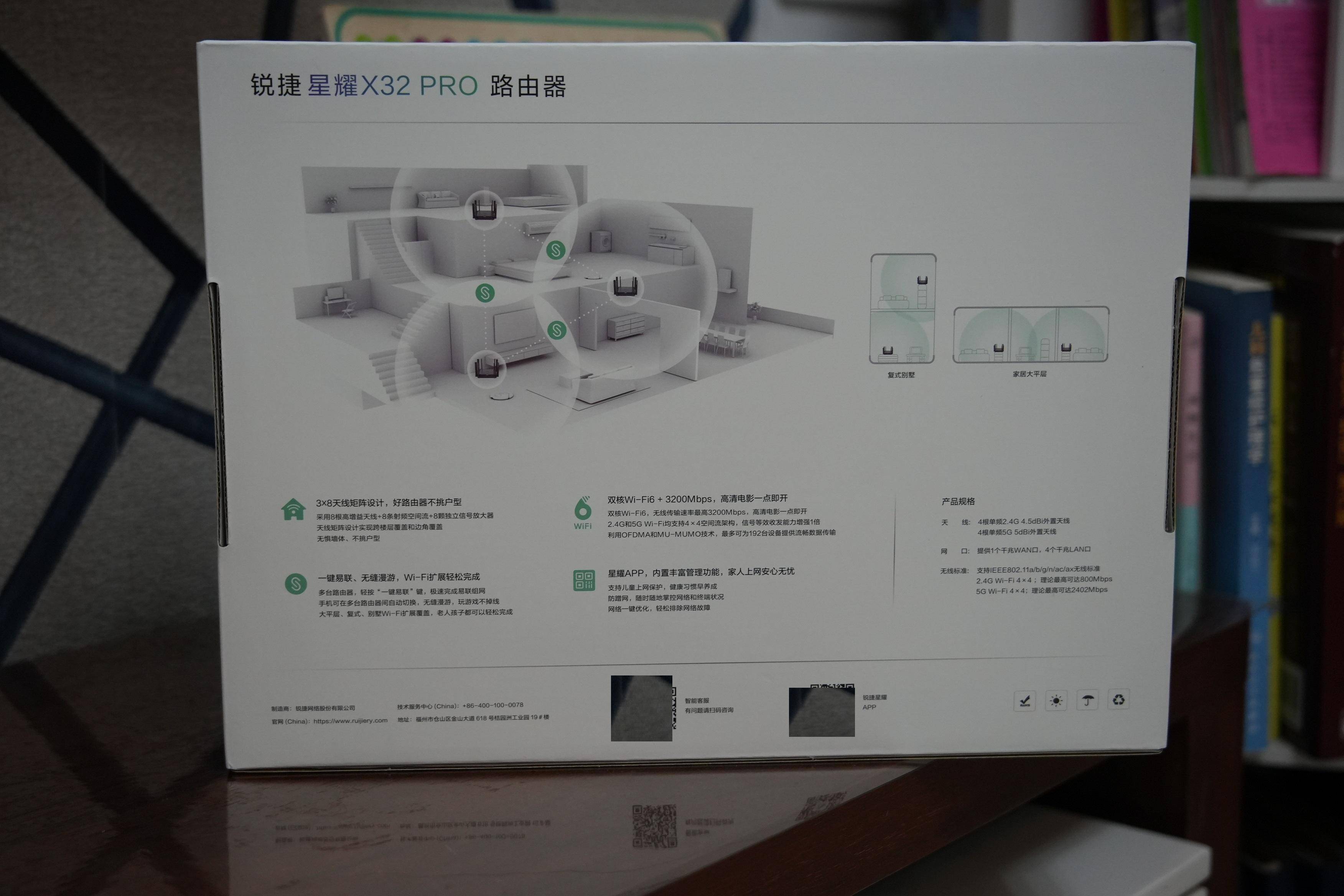锐捷X32 PRO的外包装采用了简洁的设计风格,正面展示了路由器主体图,背面列出了关键参数。这种简洁的设计一目了然,一下子就能看出这款路由器的亮点。