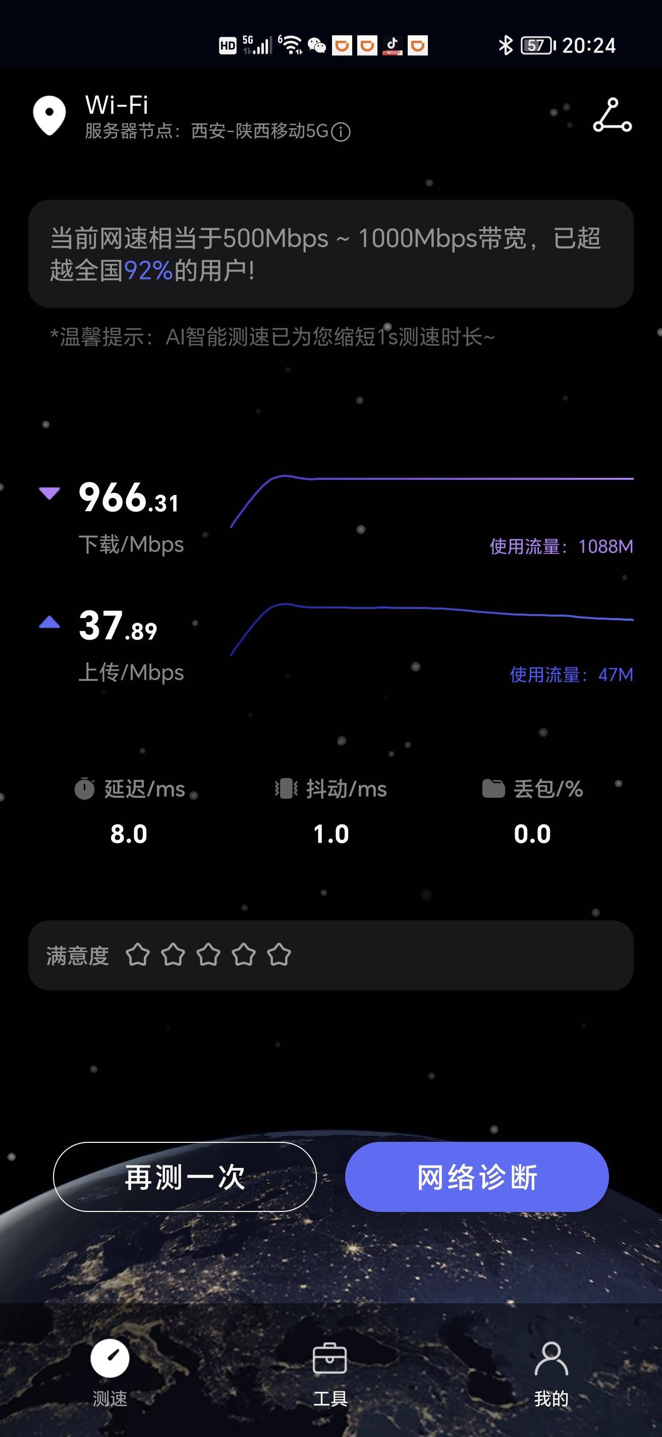 在我的测试中,不论是客厅、卧室还是厨房,信号表现都非常出色。尽管我的家庭宽带有500兆的带宽,但通过速度测试,客厅的网速可以达到966兆,卧室和厨房的网速也能达到470兆左右。即使穿越两堵墙,路由器的性能也不受影响,这种信号覆盖的出色性能让我深感印象深刻。