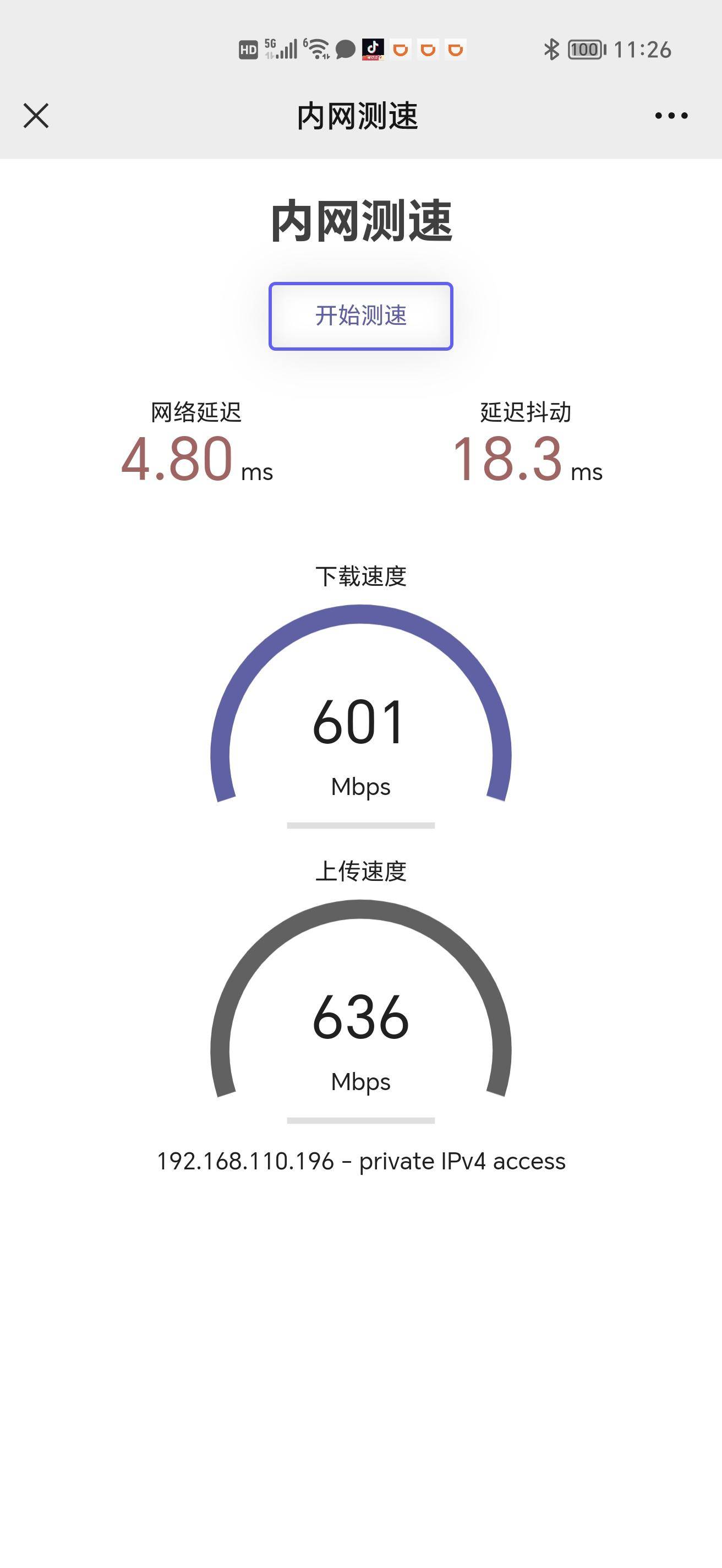通过使用电脑搭载的内容测速服务端进行测试,下载速度高达601兆,上传速度达636兆,网络延迟只有4.8毫秒,延迟抖动也仅为18.3毫秒。这些性能无疑让人印象深刻。