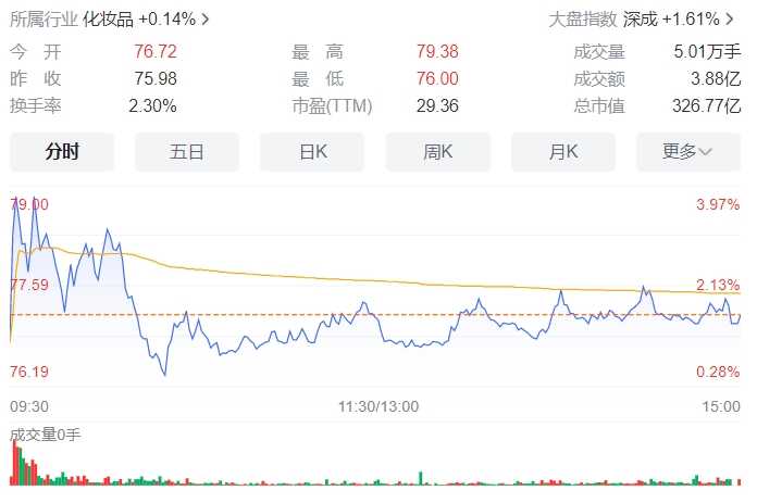 按理讲,贝泰妮Q3业绩靓丽,回购股票的金额也增加了,诚意满满,今天股市开盘应该飙升才对。实际上,贝泰妮今天盘前为75.98元/股,开盘为76.72元/股,最高飙升到79.38元,后续一直在77元之间盘旋,收盘为元77.14元/股,涨幅有限。