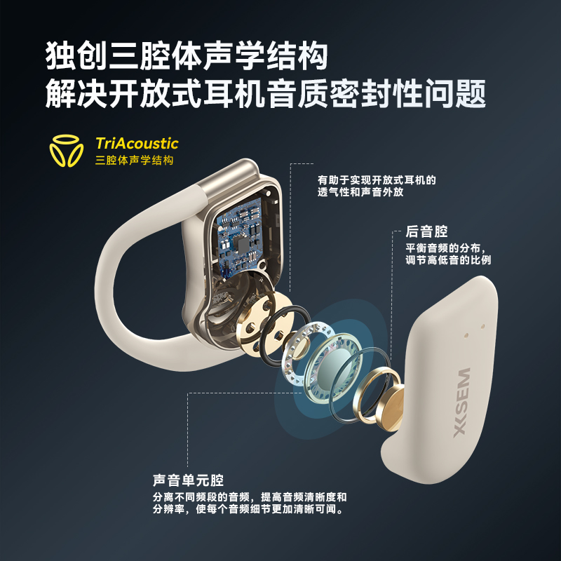 同时采用TriAcoustic三腔体声学设计方式,基于声学分隔、振动控制和腔室协同原理,改善了开放式耳机的声音发散、漏音等开放式耳机音质的密封性问题,创造出更好的音质、音场。