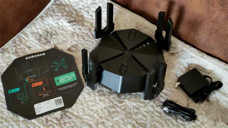标准且略带差异化的产品及配件,八边形竖立着四枚“蝎钳”的黑色路由器,一份同为八边形的彩色说明书,一条千兆网线,以及一副12V=3A的电源适配器。