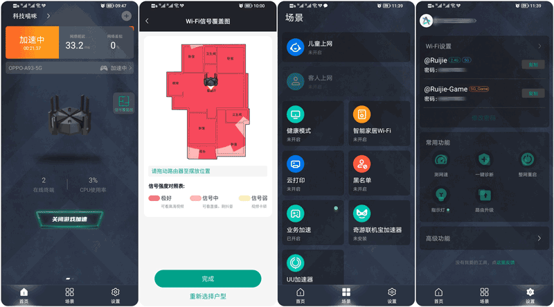 通过扫描说明书可以下载到专属路由器的锐捷星耀管理APP,通过绑定即可在APP上非常直观的看到各项操作功能,深色的管理界面看起来非常有feel,并且在开启加速功能后主界面上的天蝎路由还会呈现出起飞的动态画面。并且根据内置的户型图还能实现路由器摆放信号的模拟,清晰分明的功能排列,让用户通过简单的学习就能够快速上手玩转操作。